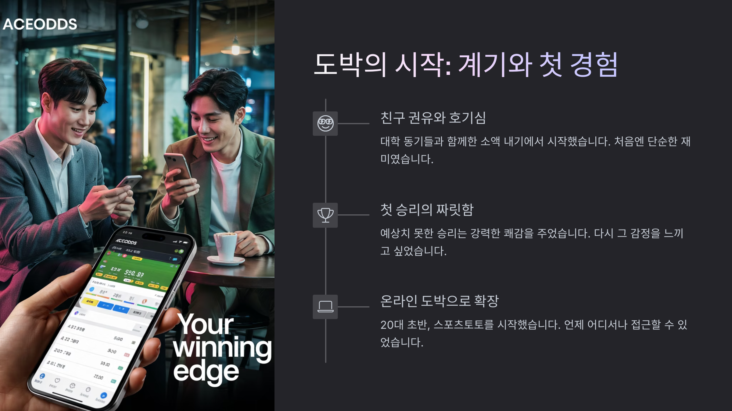 도박이라는 건, 처음엔 재미로 시작해요. 친구들과 소소하게 스포츠토토를 하다가, 어느 순간부터 '이번엔 좀 벌 수 있겠지?' 하는 기대가 생기고, 그게 반복되면서 중독이 되어버려요. 나도 그렇게 빠졌고, 하루하루가 도박 생각뿐이었어요.