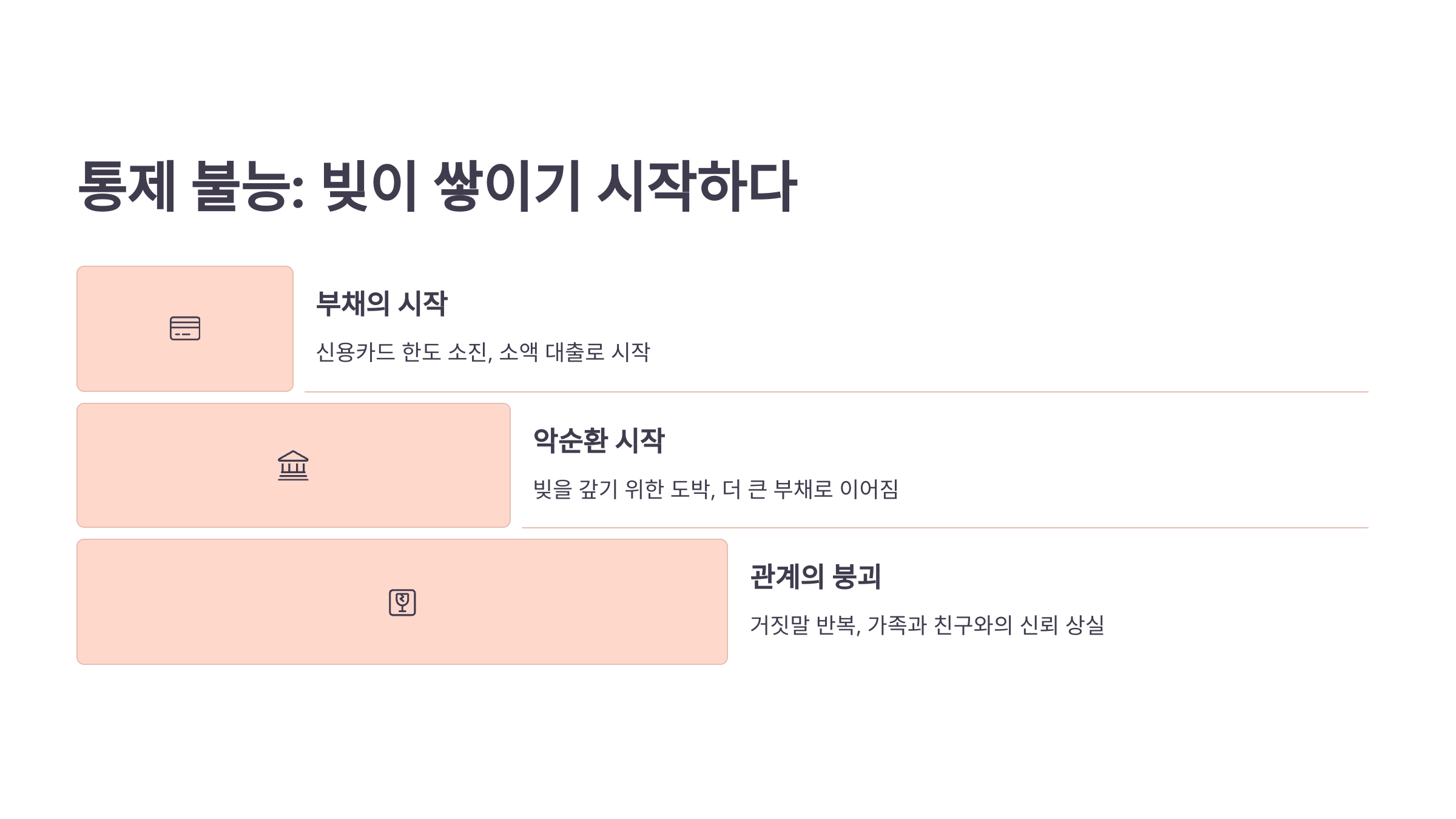 도박은 이긴 기억만 뇌에 각인돼서, 자꾸만 "이번엔 더 벌 수 있을 것 같다"는 착각에 빠지게 만들어요. 그는 점점 더 많은 돈을 걸게 되었고, 한도를 넘는 신용카드 사용, 현금서비스, 사채까지 손을 뻗게 됐죠. 수천만 원의 빚이 어느새 눈덩이처럼 불어나 있었어요.