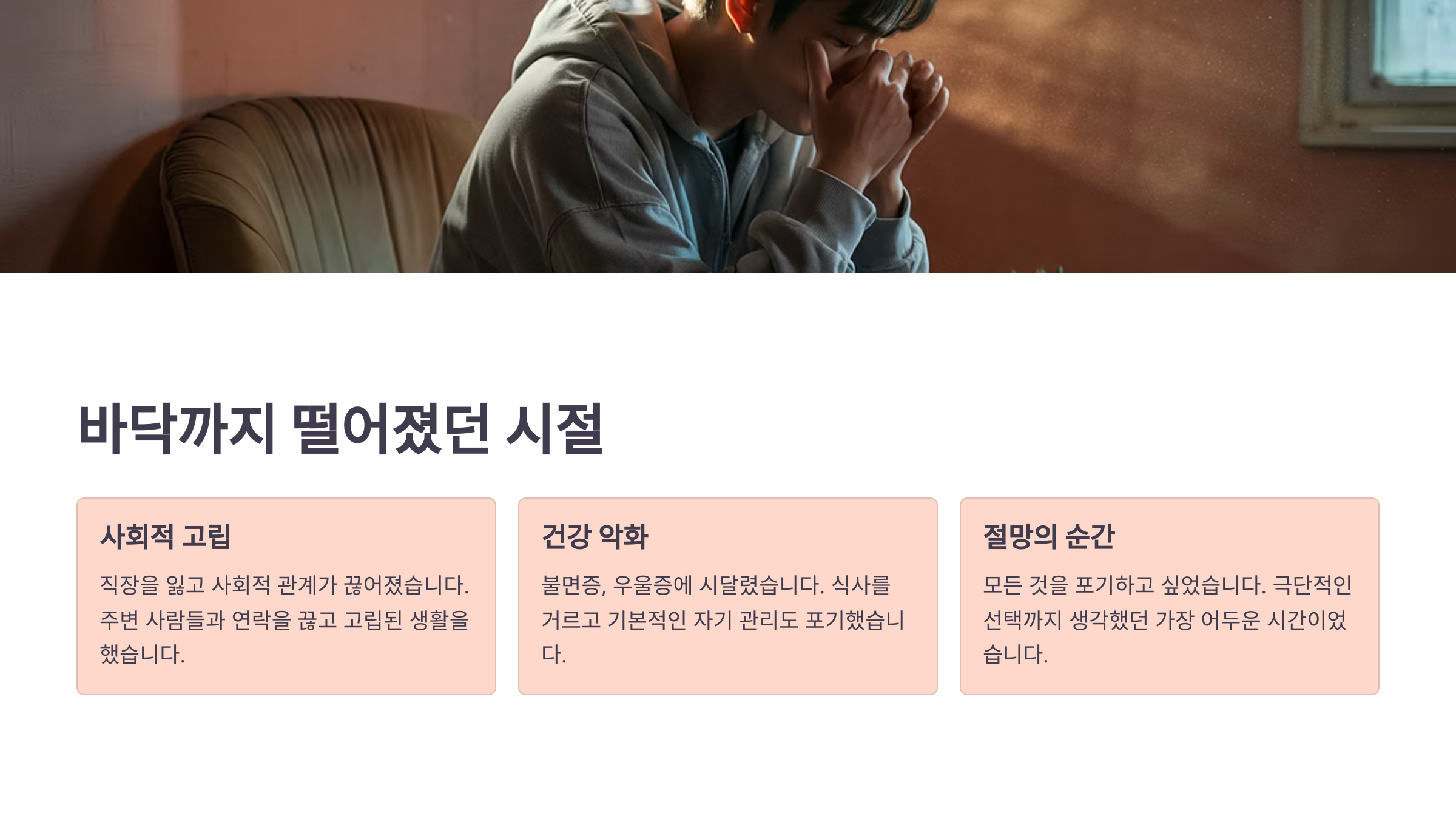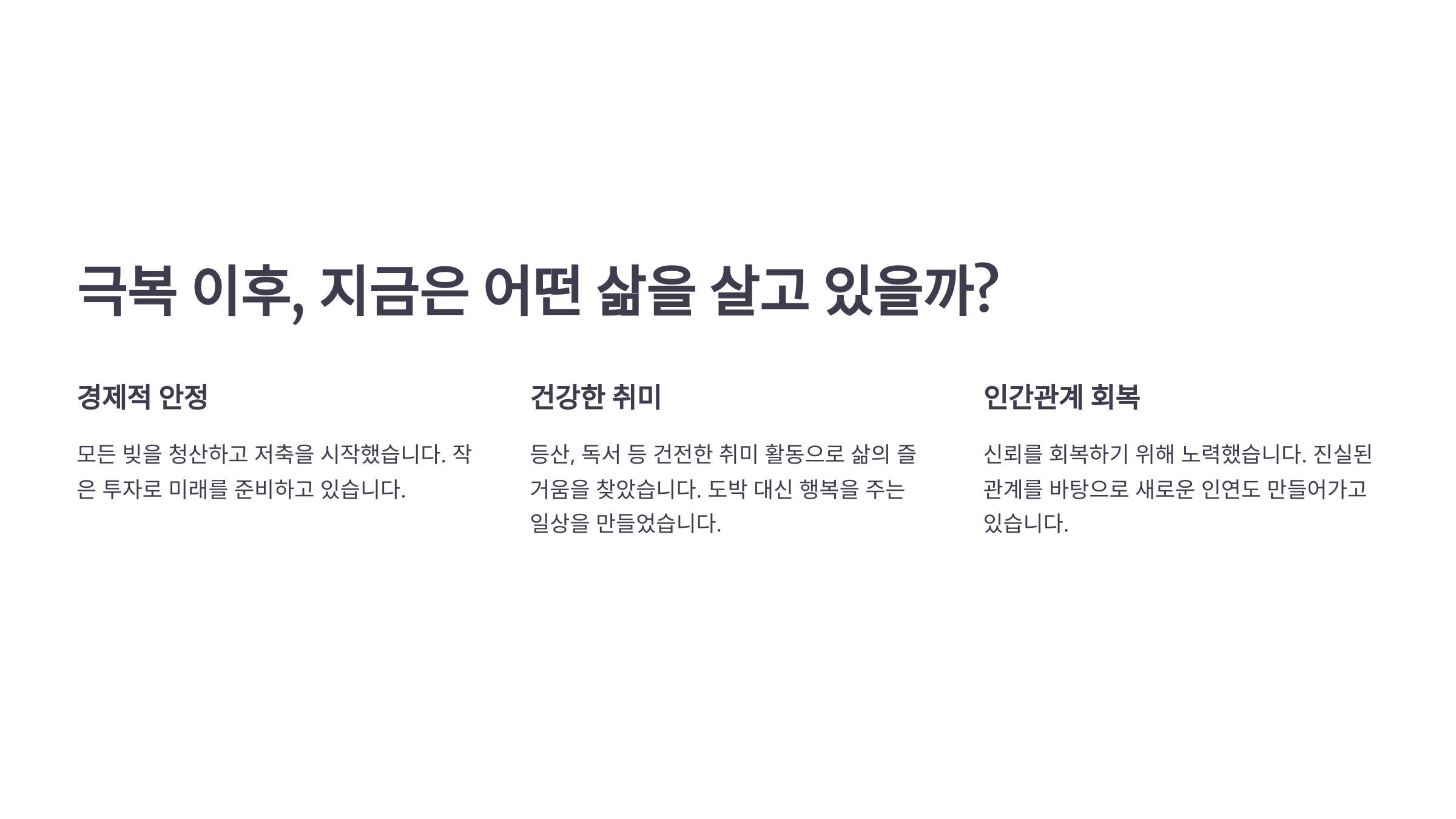 월 수입 -300,000원(적자) 2,300,000원(흑자) 생활패턴 불규칙, 밤샘 도박 규칙적인 출퇴근 정신건강 우울, 자존감 하락 자신감 회복, 희망 숫자보다 더 중요한 건 그의 마음가짐이었어요. 자신을 바꿔보겠다는 진심, 다시는 과거로 돌아가지 않겠다는 다짐이 그를 더 강하게 만들었어요. 회복은 단순히 돈 문제가 아니라 ‘삶의 태도’를 바꾸는 일이더라고요.