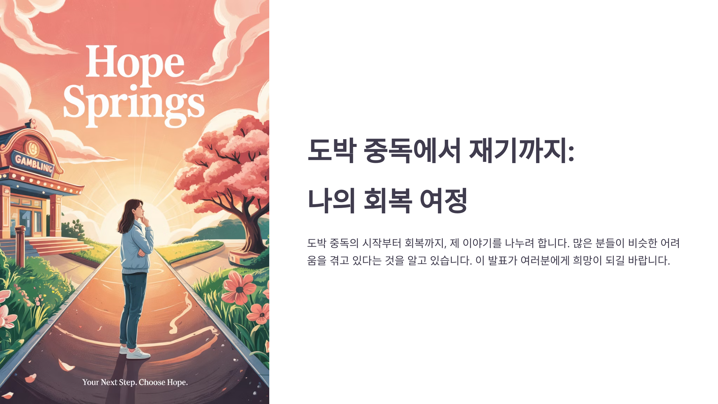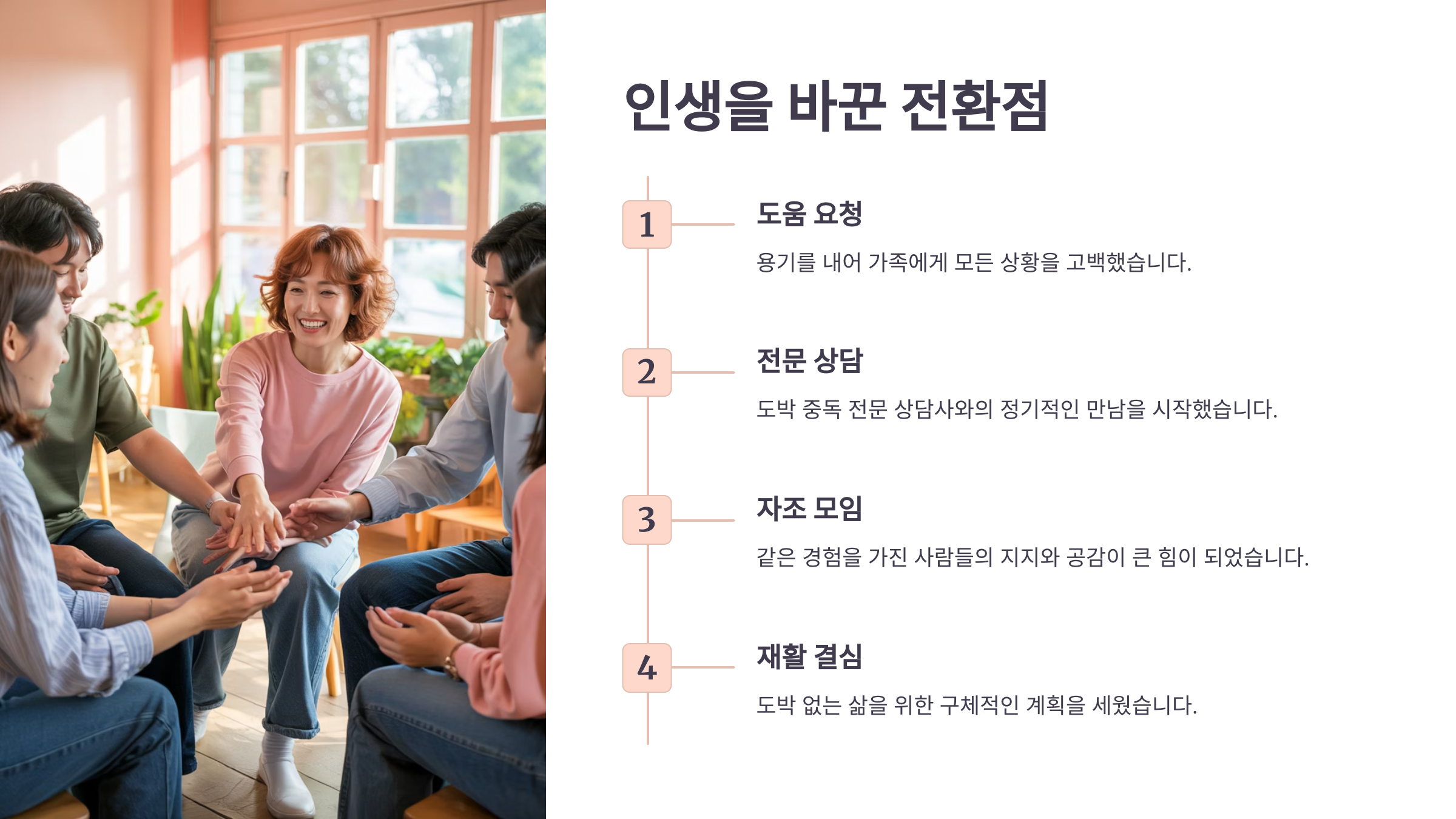 가장 무서운 건 도박을 멈출 '이유'가 점점 사라진다는 거예요. 그는 말했어요. "도박은 희망이 아니라 절망을 팔아요. 내가 바보 같았던 게 아니라, 도박 자체가 사람을 이렇게 망가뜨려요."