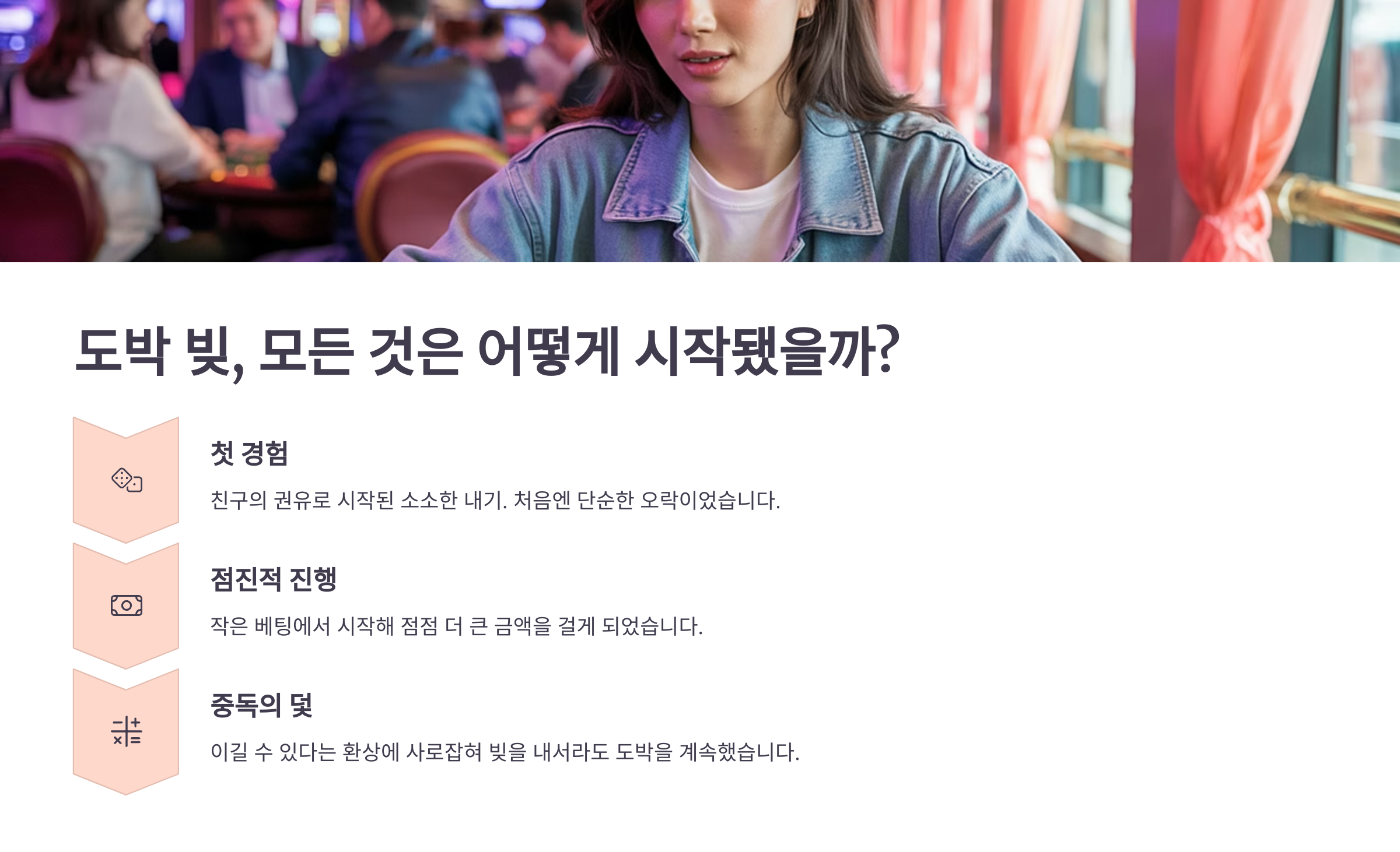 1단계 호기심과 소액 베팅 ⚠ 낮음 2단계 승리에 대한 환상, 반복 베팅 ⚠⚠ 중간 3단계 빚 증가, 거짓말, 생활 무너짐 ⚠⚠⚠ 매우 높음 표에서 보듯, 도박은 단계적으로 사람을 무너뜨려요. 처음엔 가볍지만 빠져나올수록 더 큰 희생이 따르게 되는 거죠. 이 글을 읽는 당신이 혹시라도 1단계에 있다면, 지금이라도 빠져나오기를 정말 바래요.