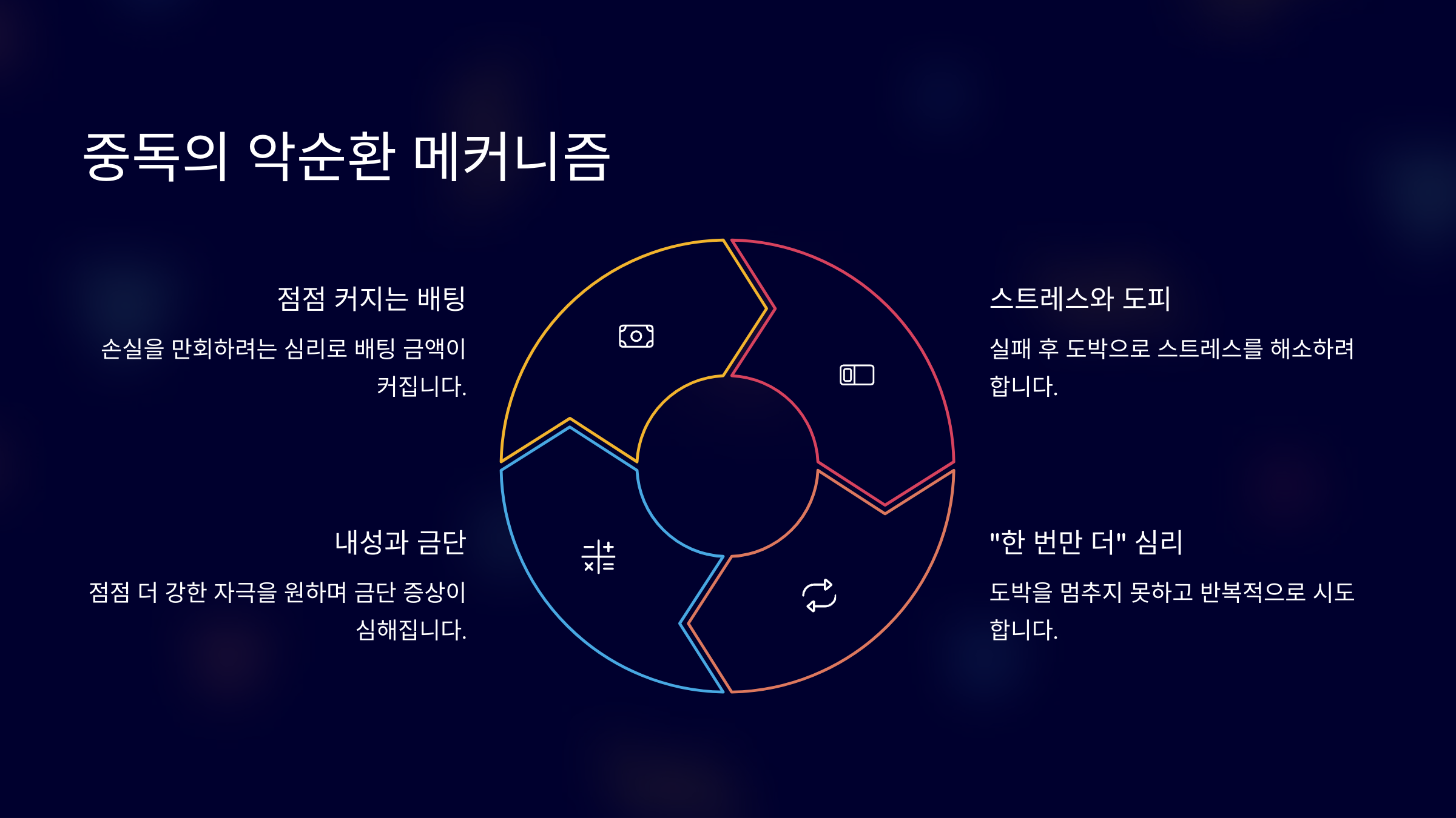 도박중독은 마치 끝없는 회전목마를 타는 것과 비슷해요. 한번 시작하면 멈추기가 어려워지고, 반복될수록 점점 빠져나오기 힘들어져요. 이걸 '중독의 악순환'이라고 부르는데, 정말 무서운 구조를 가지고 있어요.