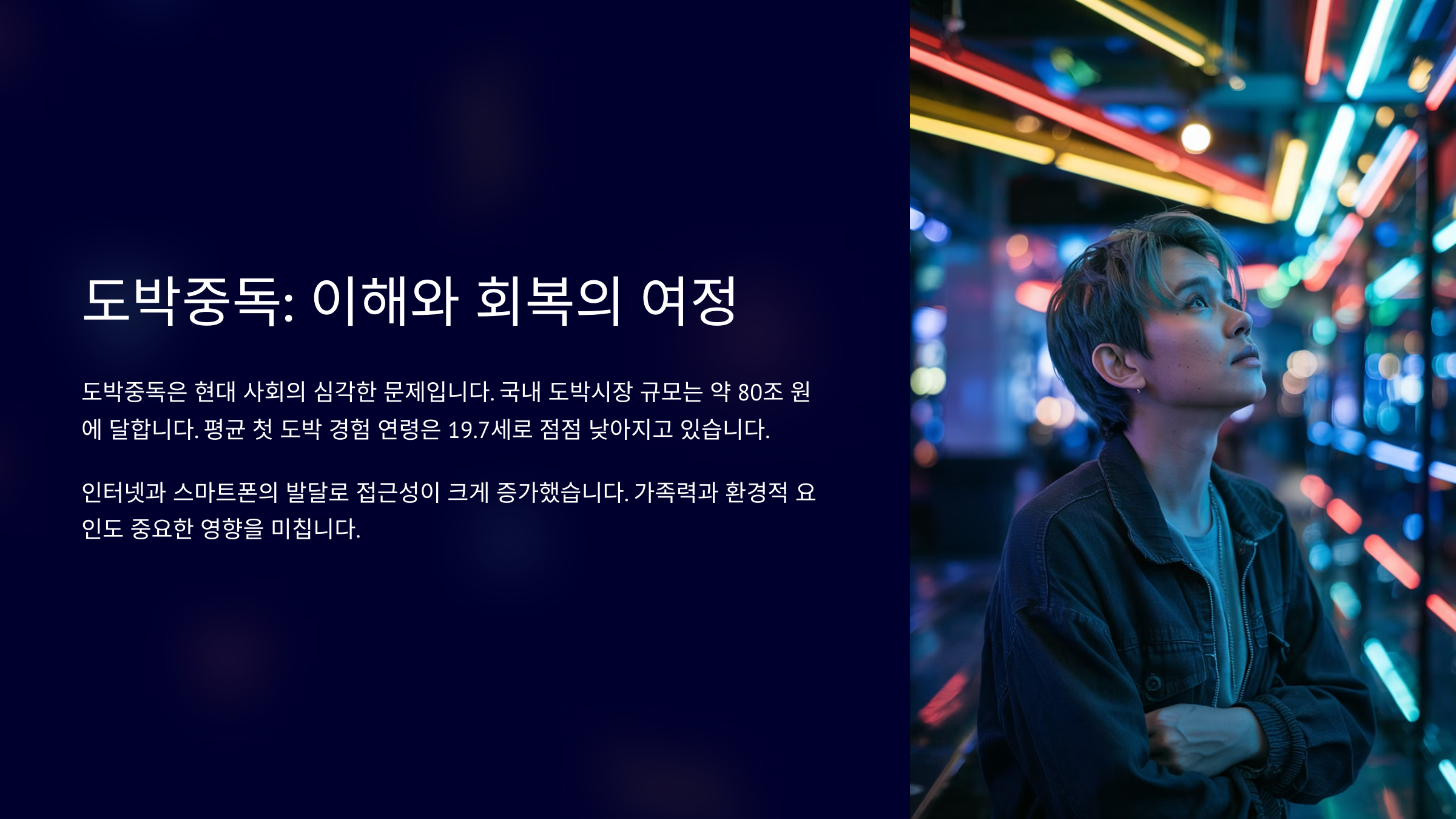 내가 생각했을 때, 도박은 단순히 돈 문제로 끝나지 않아요. 자존감, 인간관계, 심지어 삶 전체를 무너뜨릴 수 있는 파괴력이 있어요. 그래서 초기에 경각심을 가지고 접근하는 것이 정말 중요하다고 느껴요.