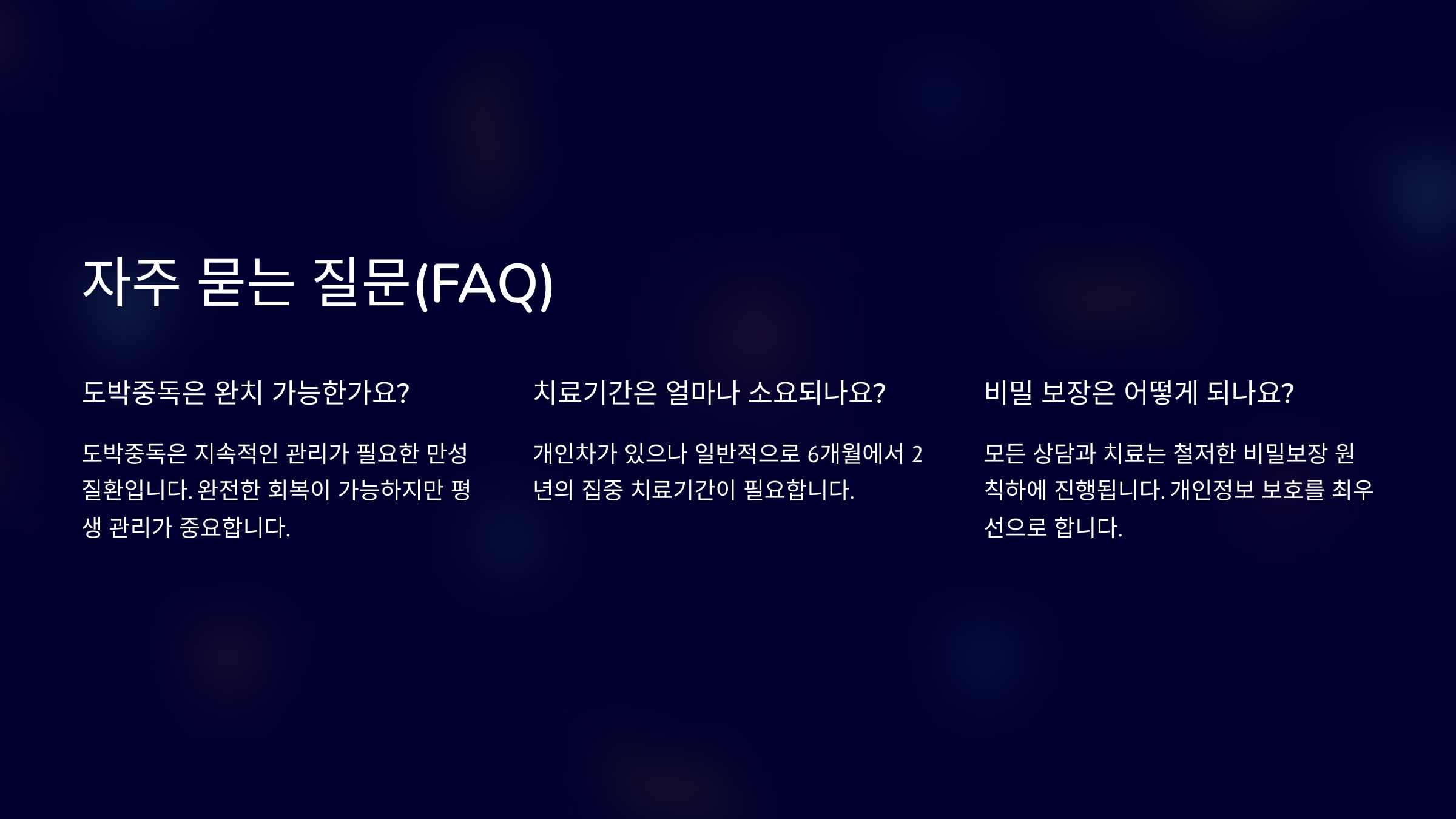 A4. 개인차가 크지만 최소 몇 달에서 수년에 걸쳐 지속적인 관리와 치료가 필요해요.