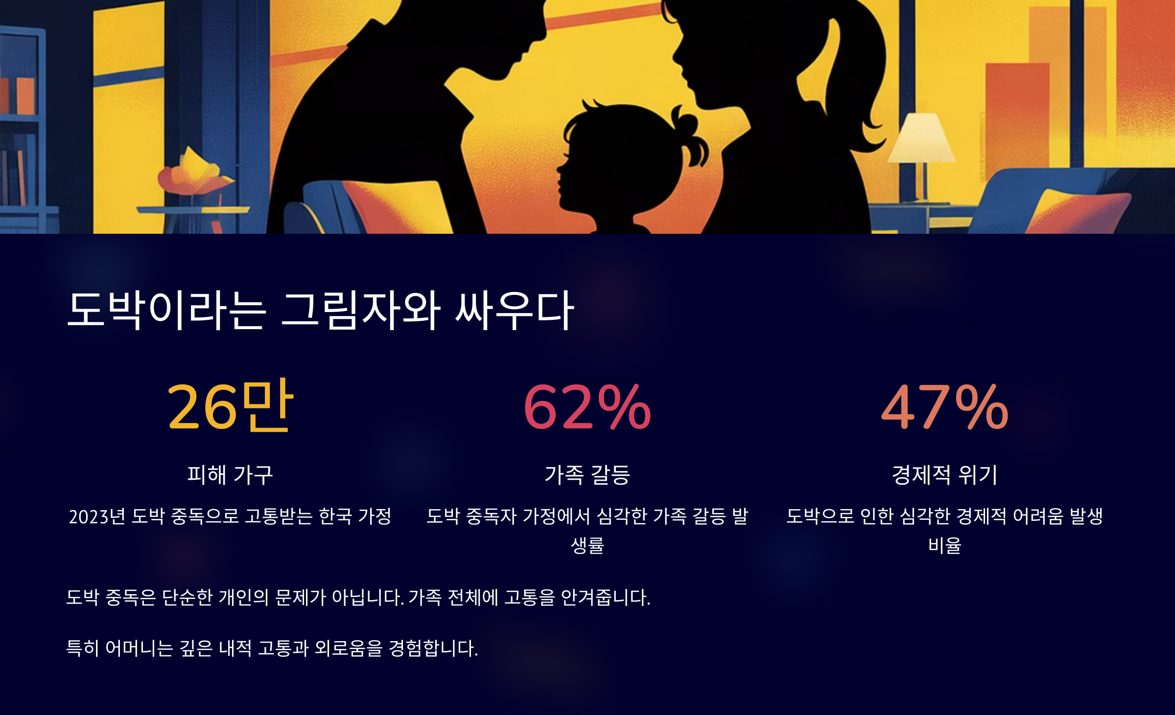 아이를 바라볼 때마다 죄책감이 밀려왔고, 그럴 때마다 더욱더 도망치고 싶어졌어요. 도박은 현실을 잊게 해주는 탈출구였지만, 동시에 모든 걸 앗아가는 함정이었어요.