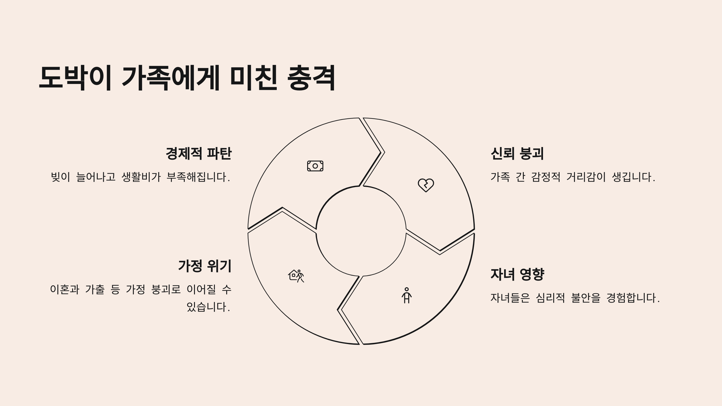 거짓말과 은폐 신뢰 손상 가족 간 의심과 불신 경제적 피해 공동 재정 파탄 채무, 재정 불안 감정적 폭발 감정 소통 단절 고립과 거리감 가족 구성원의 죄책감 부모의 자책 우울감, 무기력 가족은 서로를 지지하는 존재이기도 하지만, 위기 앞에서는 그 관계가 너무나 쉽게 무너질 수 있어요. 도박이 가족에게 미치는 상처는 단순한 돈 문제가 아니에요. 마음의 균열이 그 무엇보다 크고 오래 가더라고요.