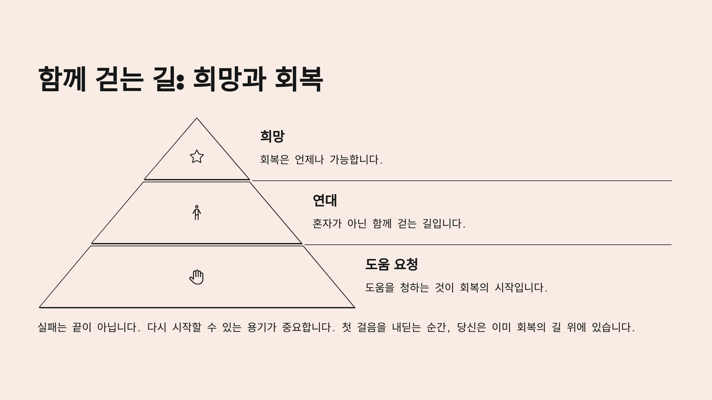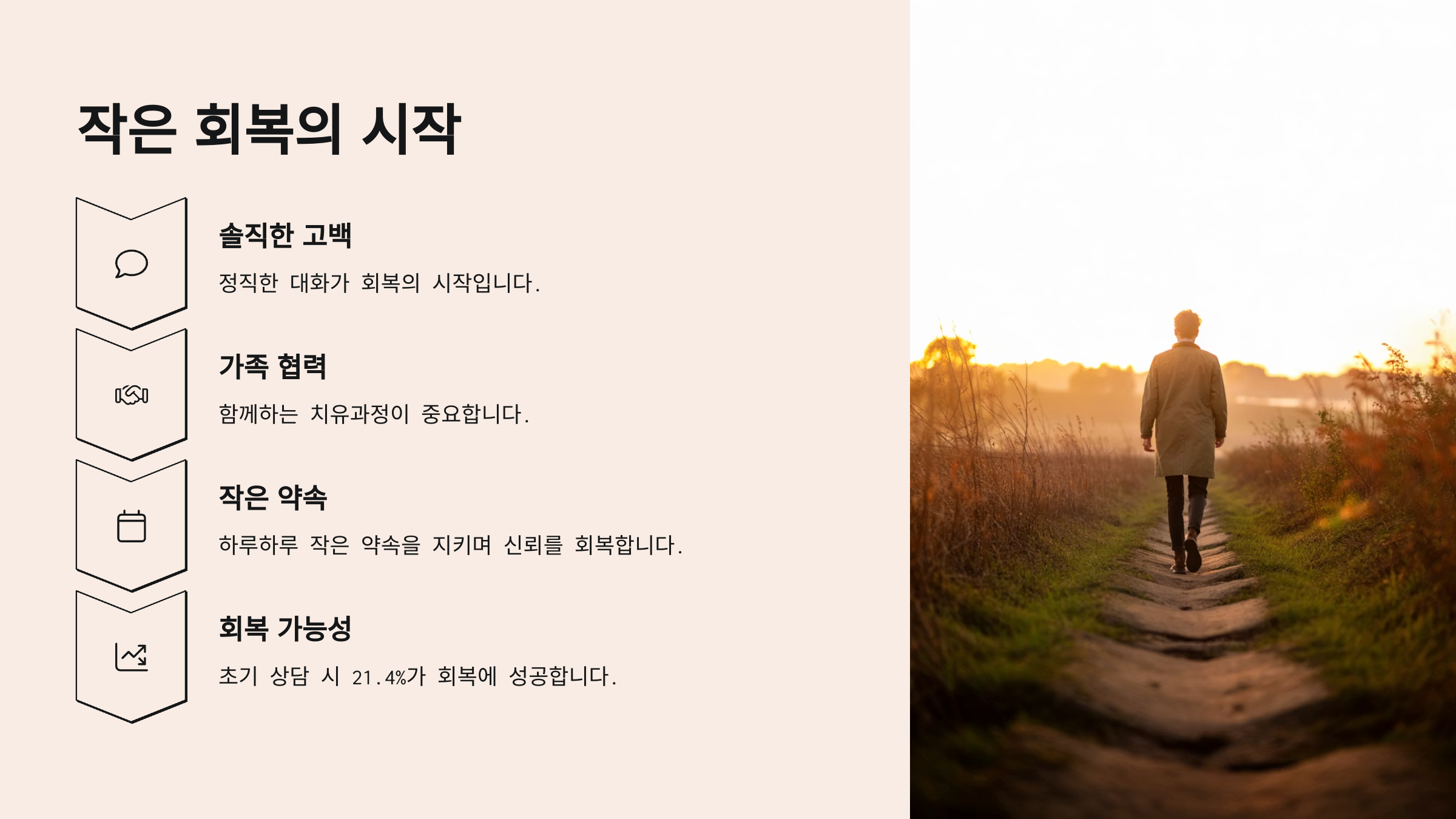 의지 생성 비난보다 경청 자발적 말하기 시작 초기 상담 상담 참여 독려 감정 표현 증가 생활 습관 개선 공동 활동 시도 일상 리듬 회복 신뢰 회복 지속적 관심과 존중 가족과의 거리 좁힘 물론 아직 완전히 회복된 건 아니에요. 때때로 불안해하고, 유혹에 흔들릴 때도 있어요. 하지만 이제는 혼자 싸우지 않아요. 우리가 함께 있다는 것, 다시 연결되었다는 것이 가장 큰 변화고 희망이에요.