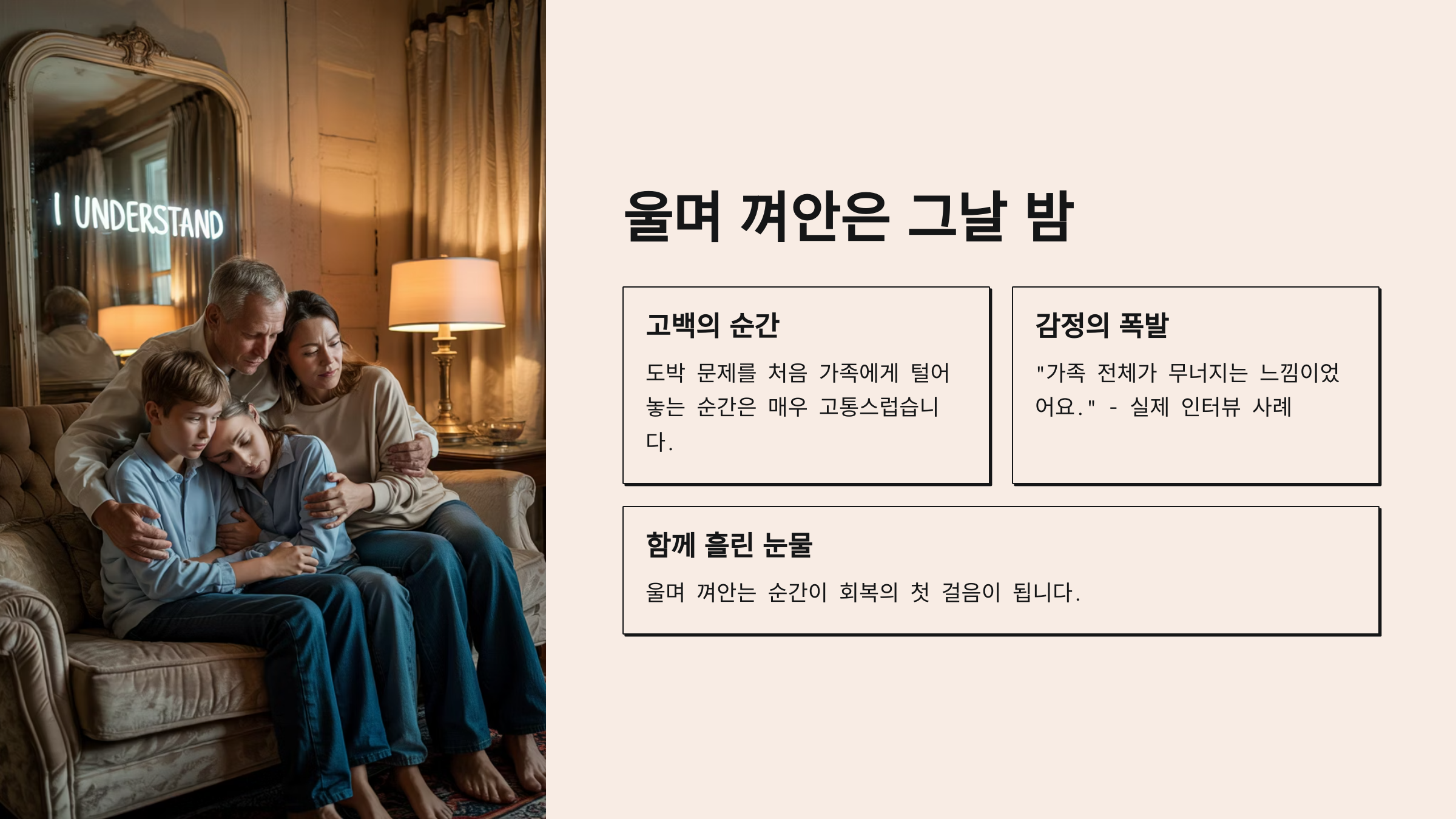 도박의 결과는 단지 아들의 삶만을 무너뜨린 게 아니에요. 가족 전체가 감정적으로, 경제적으로 큰 타격을 입었어요. 처음에는 아무도 몰랐어요. 그저 무뚝뚝해졌다고만 생각했죠. 하지만 시간이 지나면서 알 수 없는 스트레스가 집안을 무겁게 감쌌어요.