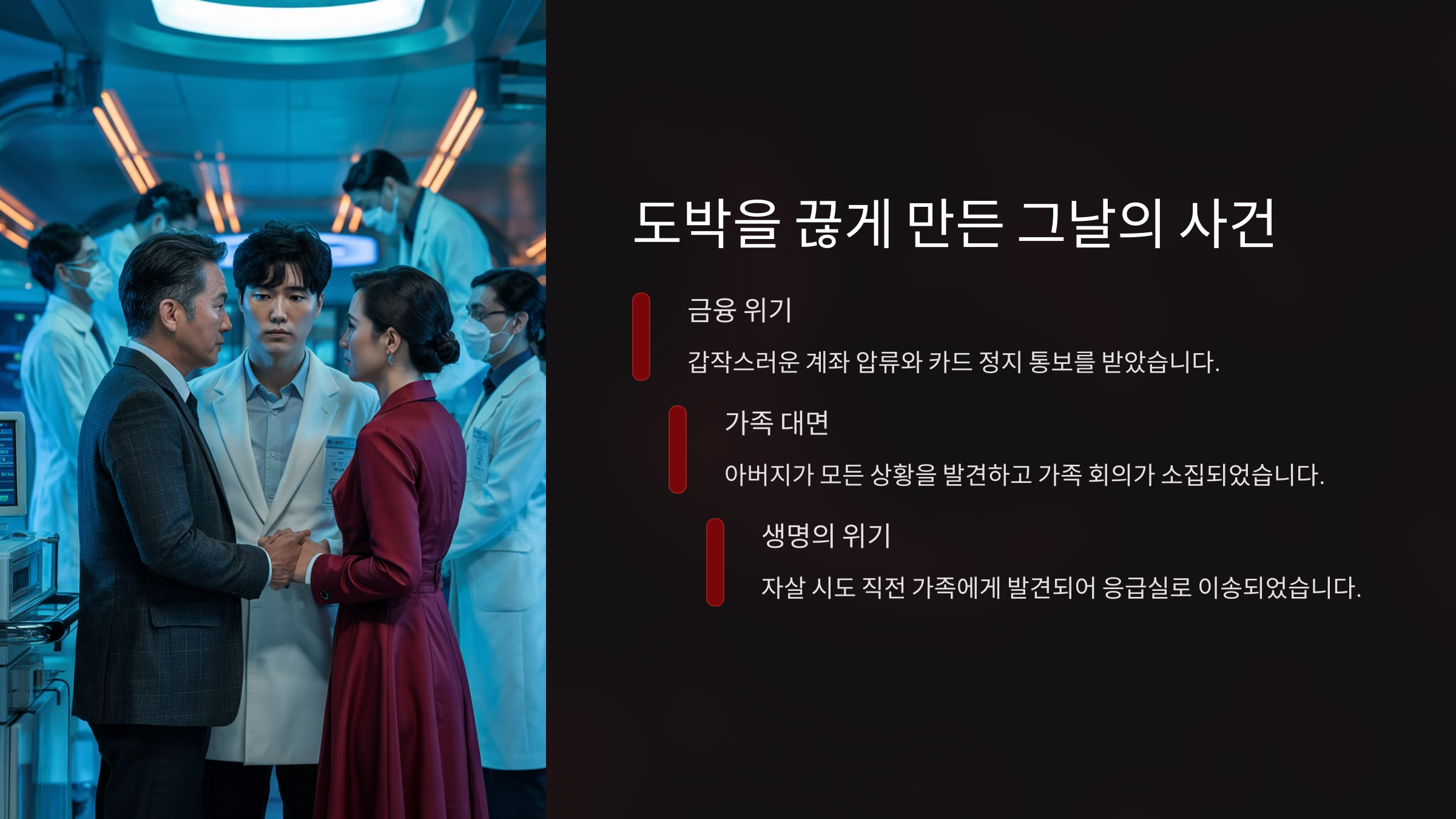 결정적인 계기는 아들이 친구에게 빌린 돈으로 또다시 베팅을 했고, 5분 만에 100만 원을 날렸다는 사실을 털어놓으면서였어요. "손이 저절로 눌렀어요. 내가 아니었어요" 라는 말을 하던 그의 눈에서 진짜 절박함이 느껴졌어요.