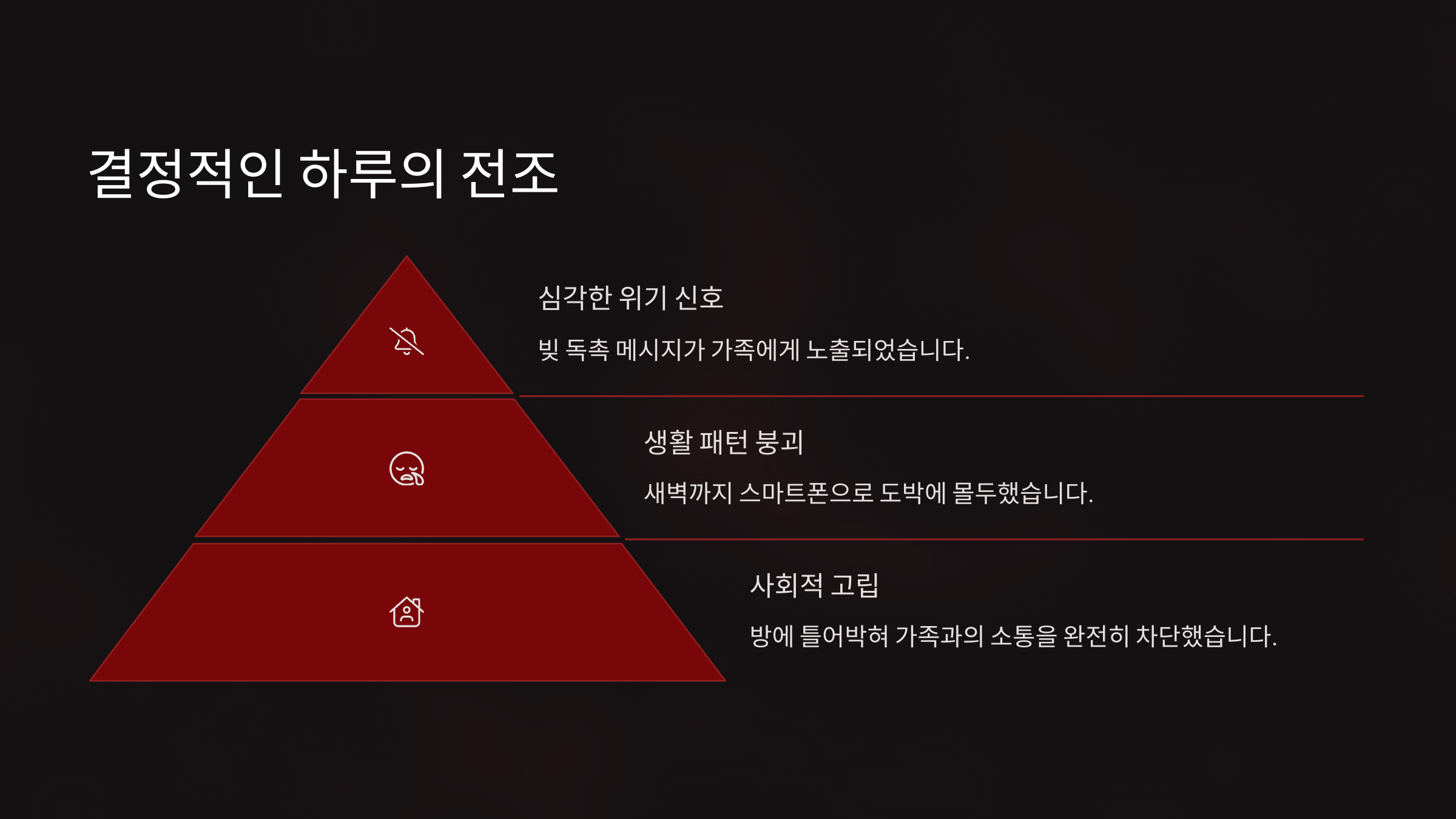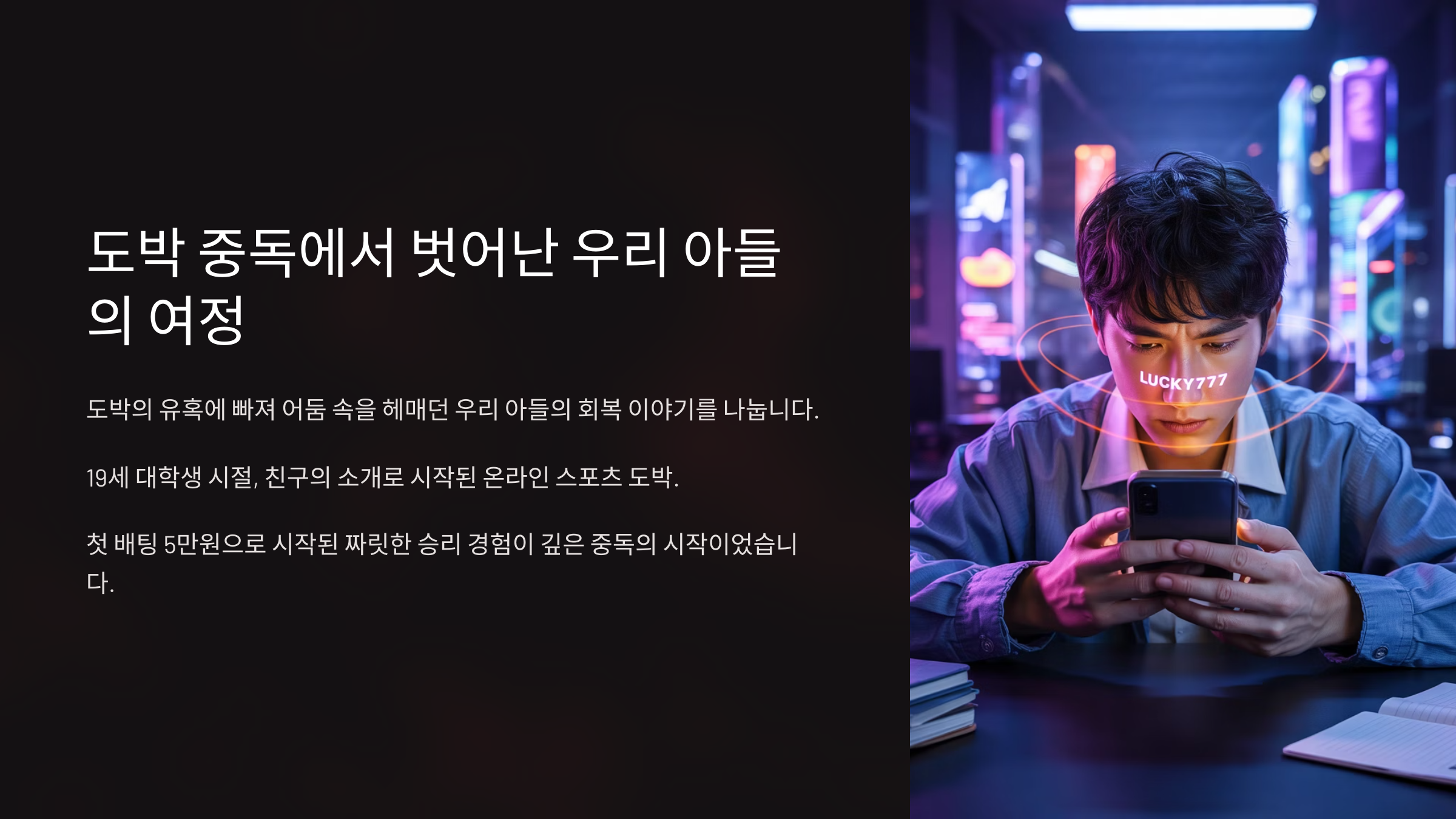 처음엔 우리도 몰랐어요. 스마트폰을 오래 보는 것도 요즘 세대에겐 당연한 일이었고, 공부 스트레스 푸는 정도로 생각했거든요. 하지만 그의 말투, 행동이 점점 달라졌어요. 돈을 자주 요구하거나 거짓말을 하기도 했고, 자주 짜증을 냈어요.