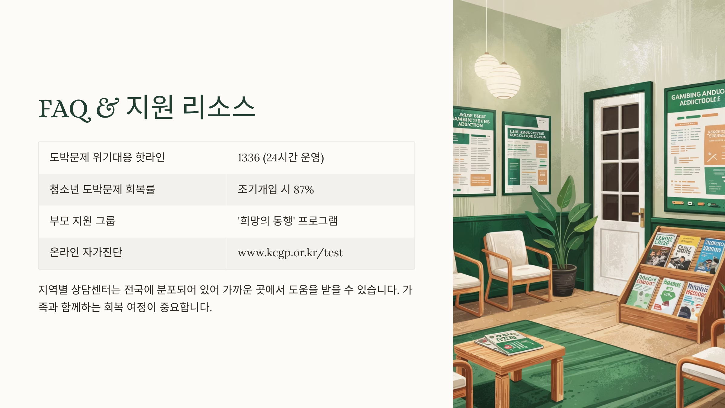 또 하나 중요한 건, 문제를 숨기지 않고 전문가에게 도움을 요청하는 용기예요. 도박 문제는 가정만의 노력으로 해결되기 어렵기 때문에, 상담센터나 관련 기관의 도움을 받는 것이 필수예요. 이때 부모가 먼저 상담을 받아보는 것도 아이의 회복을 도울 수 있어요.