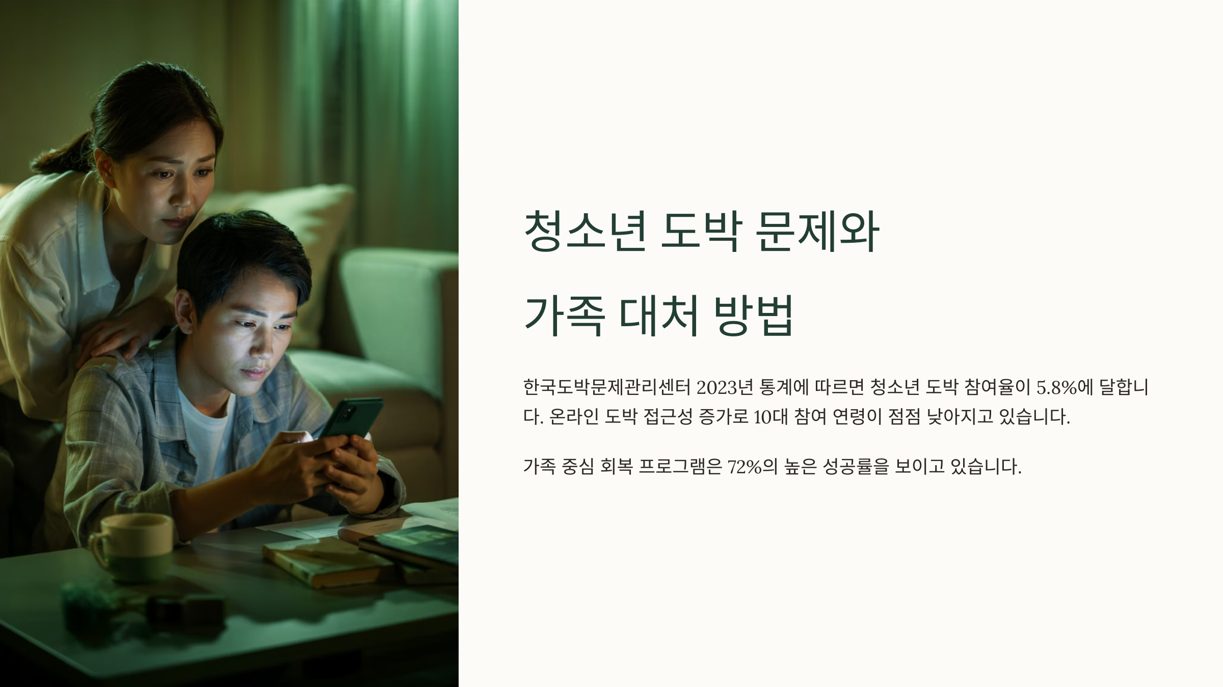 도박 중독은 단지 개인의 문제가 아니에요. 가족 전체가 함께 무너질 수 있는 무서운 파장을 일으켜요. 특히 부모는 자녀의 문제를 자신의 실패로 받아들이기 쉽고, 자책과 분노, 슬픔 사이에서 감정적으로 크게 흔들리게 되죠.