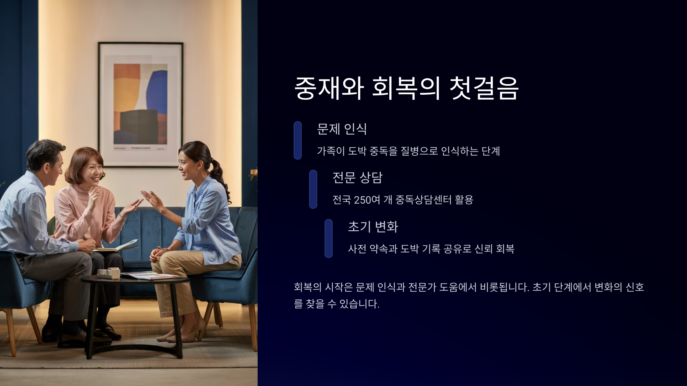 도박 중독은 단기전이 아니에요. 장기적으로 봐야 해요. 특히 회복이 시작된 후가 더 중요해요. 가족은 일상에서 계속해서 관심과 애정을 표현해야 했어요. 단순한 질문 하나, 함께 보내는 시간 하나하나가 큰 힘이 되기도 하죠.