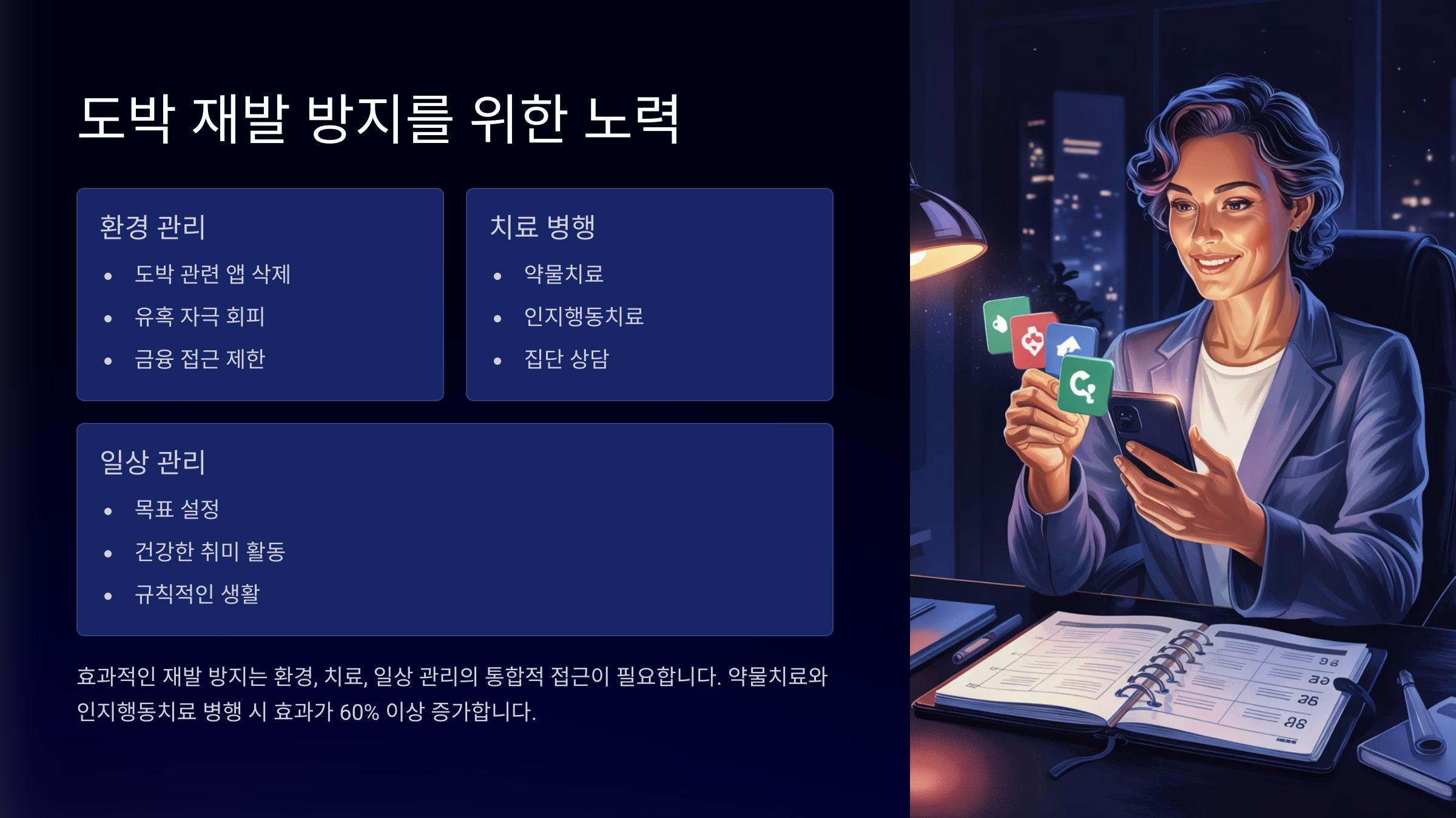 먼저 디지털 환경을 정비했어요. 도박 관련 앱을 삭제하고, 휴대폰에서 결제 기능을 제한했죠. 또한 컴퓨터와 스마트폰 사용 시간도 일정하게 관리하면서, 게임이나 유튜브처럼 빠져들 수 있는 콘텐츠는 일정 시간만 허용했어요. 자극을 줄이기 위한 환경 관리가 핵심이에요.