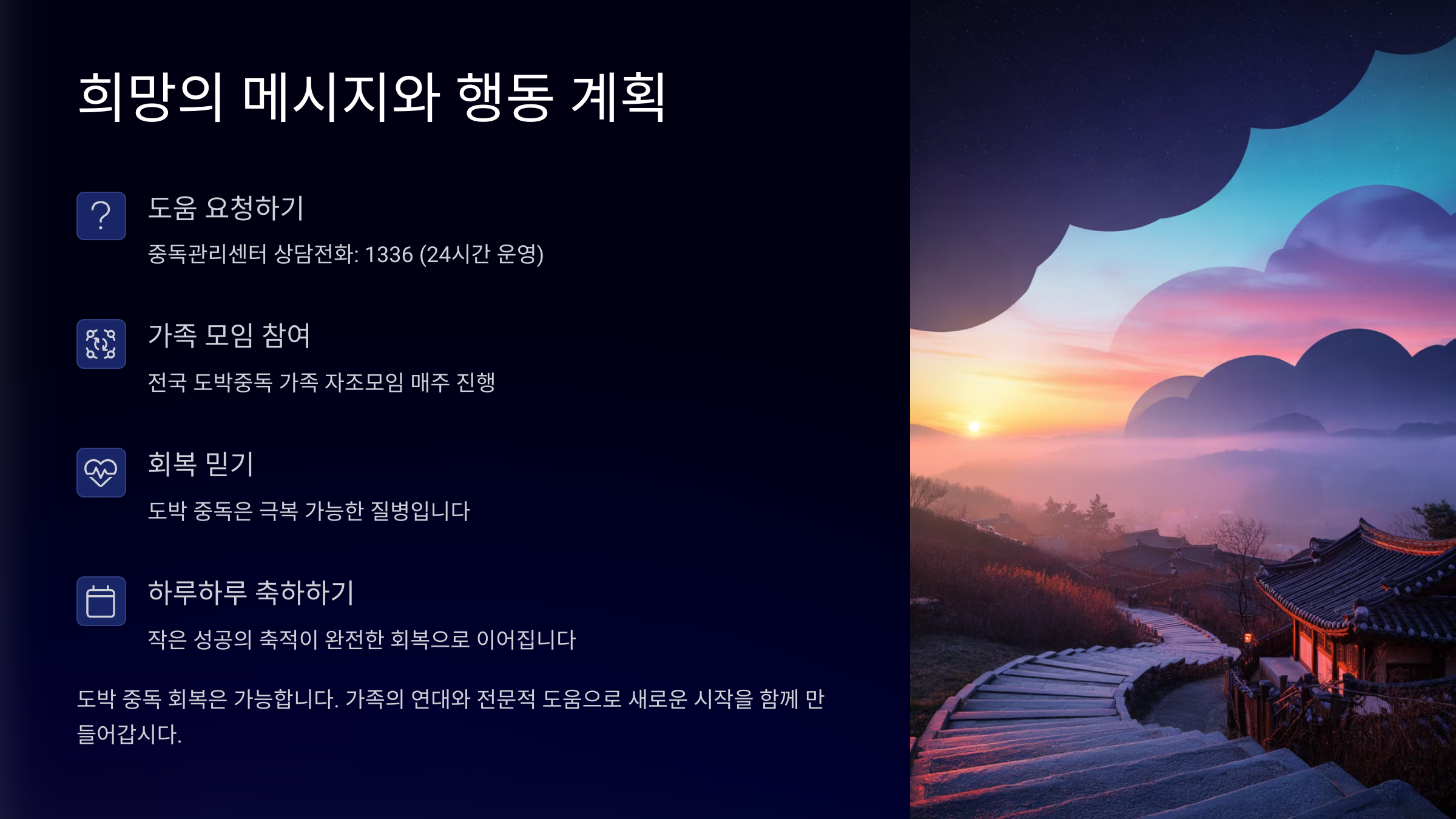 이처럼 도박 중독은 개인만의 문제가 아니에요. 가족 전체가 함께하고, 함께 회복해나가야 하는 공동 과제예요. 당신도 혼자가 아니라는 걸 잊지 마세요. ❤️