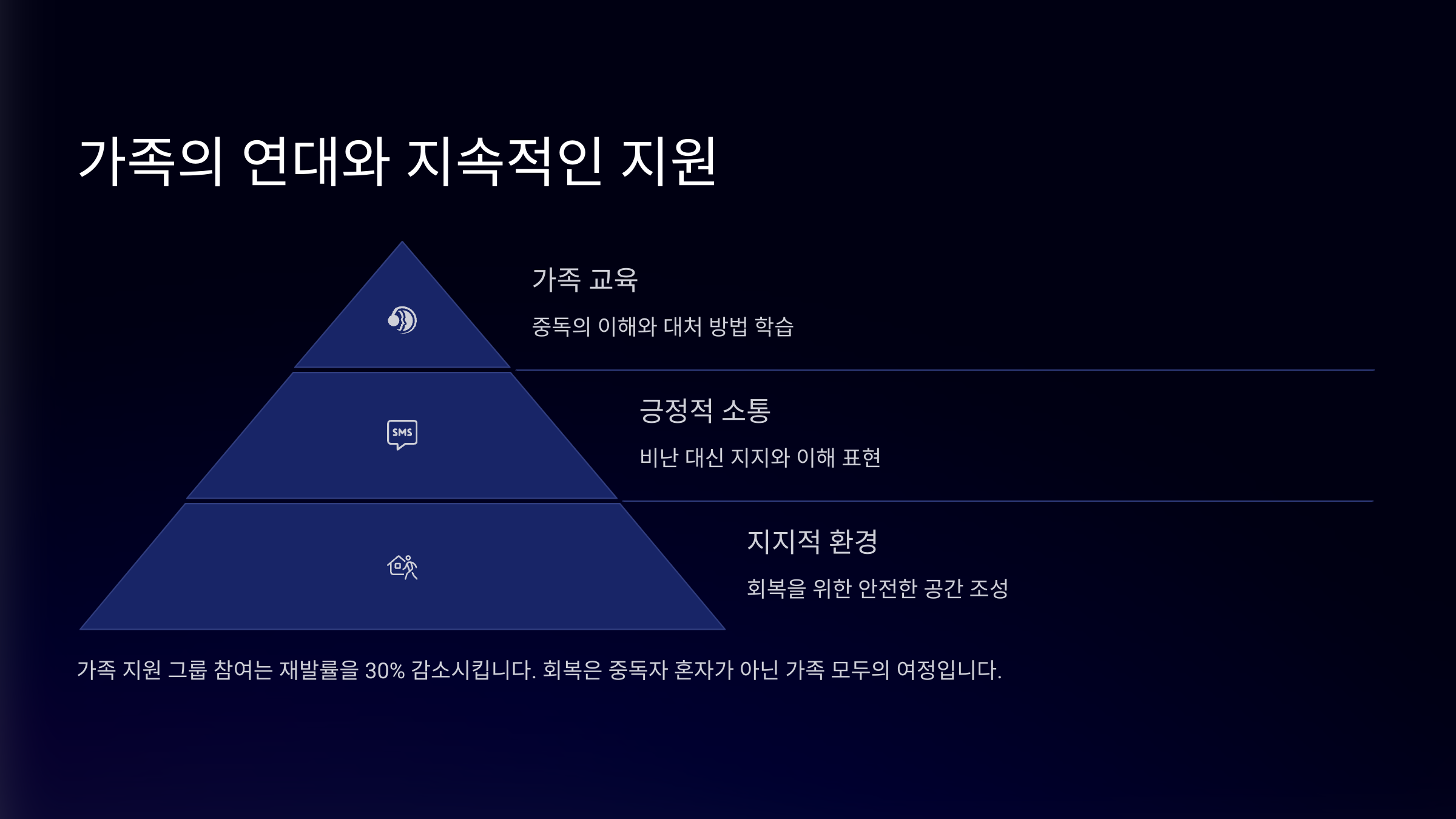 환경 차단 앱 삭제, 결제 제한 충동 최소화 생활 루틴화 규칙적인 하루 운영 정서 안정 정서 교류 자조 모임 참석 소속감 회복 회복은 하루아침에 끝나는 일이 아니에요. 재발의 위기는 언제든 찾아올 수 있기에, ‘함께 이겨내는 힘’이 중요해요. 그 무엇보다 중요한 건 자식을 향한 변치 않는 믿음과, 그걸 행동으로 보여주는 부모의 끈기예요. 그게 가장 강력한 재발 방지 약이 된답니다.
