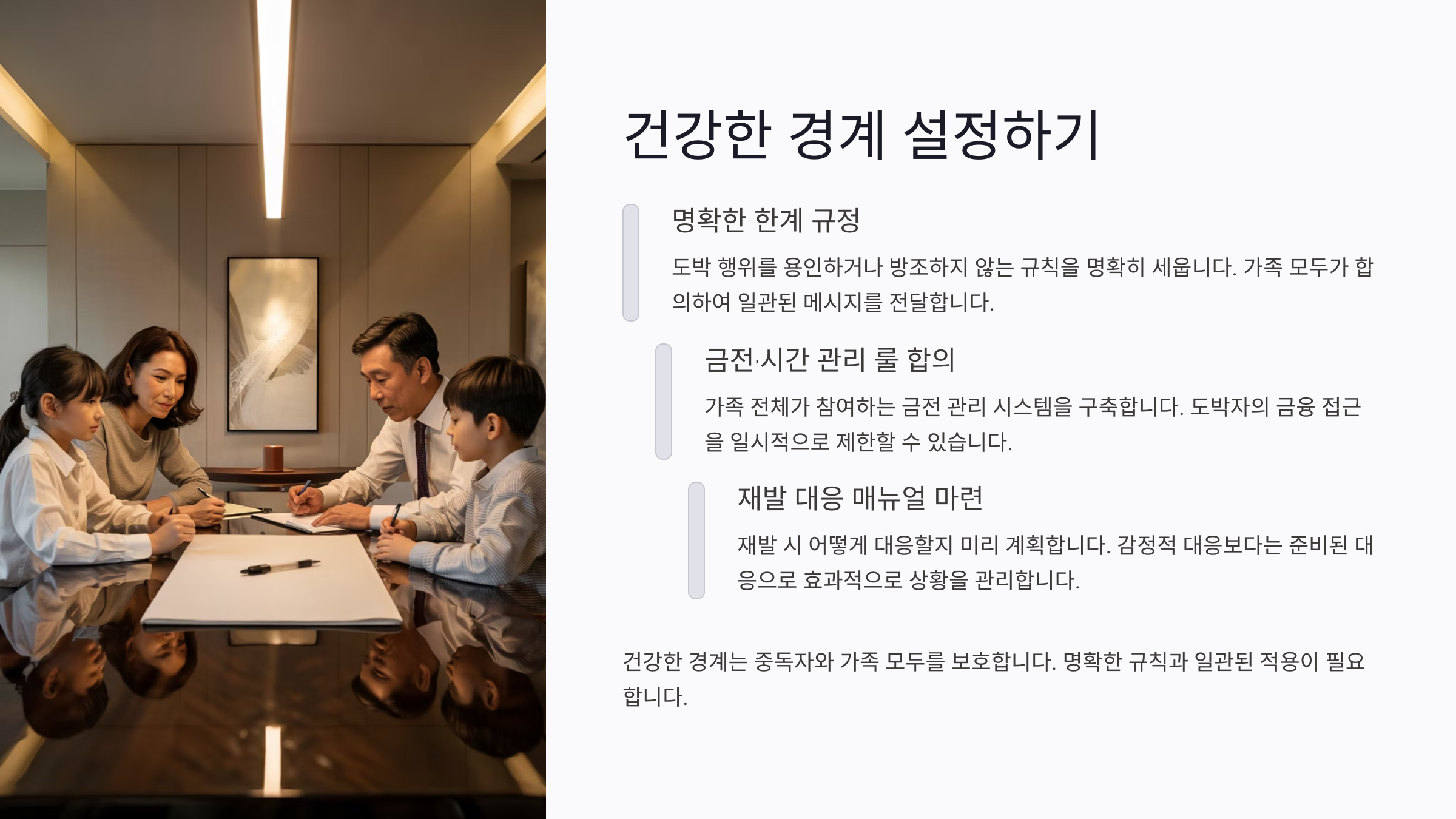 도박 중독 문제를 다루면서 부모가 반드시 배워야 할 중요한 스킬이 있어요. 바로 '건강한 경계'를 설정하는 거예요. 사랑과 지원은 필수지만, 무조건적인 용납은 오히려 상황을 악화시킬 수 있어요. 아이를 돕겠다는 마음으로 모든 걸 다 들어주다 보면, 결국 아이는 변화할 동기를 잃게 돼요.