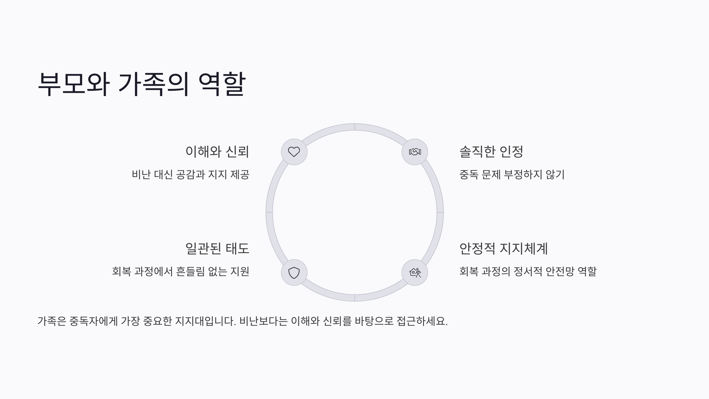 1단계: 인정 도박 문제가 있음을 가족 모두가 인정하기 비난 대신 수용 2단계: 소통 감정을 솔직히 표현하고 듣기 공감과 경청 3단계: 변화 가족 모두가 변화를 위해 노력하기 책임과 지지 가족은 서로를 지지할 때 가장 큰 힘이 돼요. 서로를 원망하기보다, "우리가 함께 이겨낼 수 있다"는 믿음을 꼭 붙잡아야 해요. 그것이 진정한 가족 치유의 힘이에요. 🌱