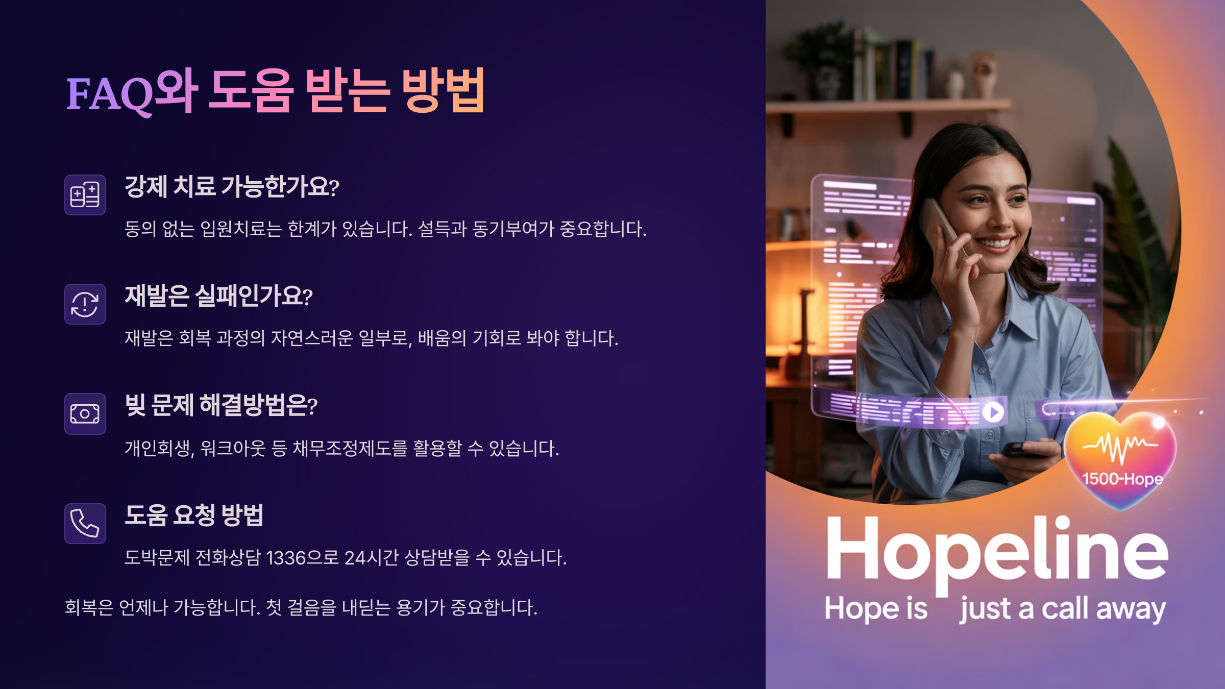 Q1. 도박 중독은 정말 치료가 가능한가요?A1. 네, 가능합니다! 꾸준한 상담과 지지, 전문적인 치료를 통해 충분히 회복할 수 있어요.