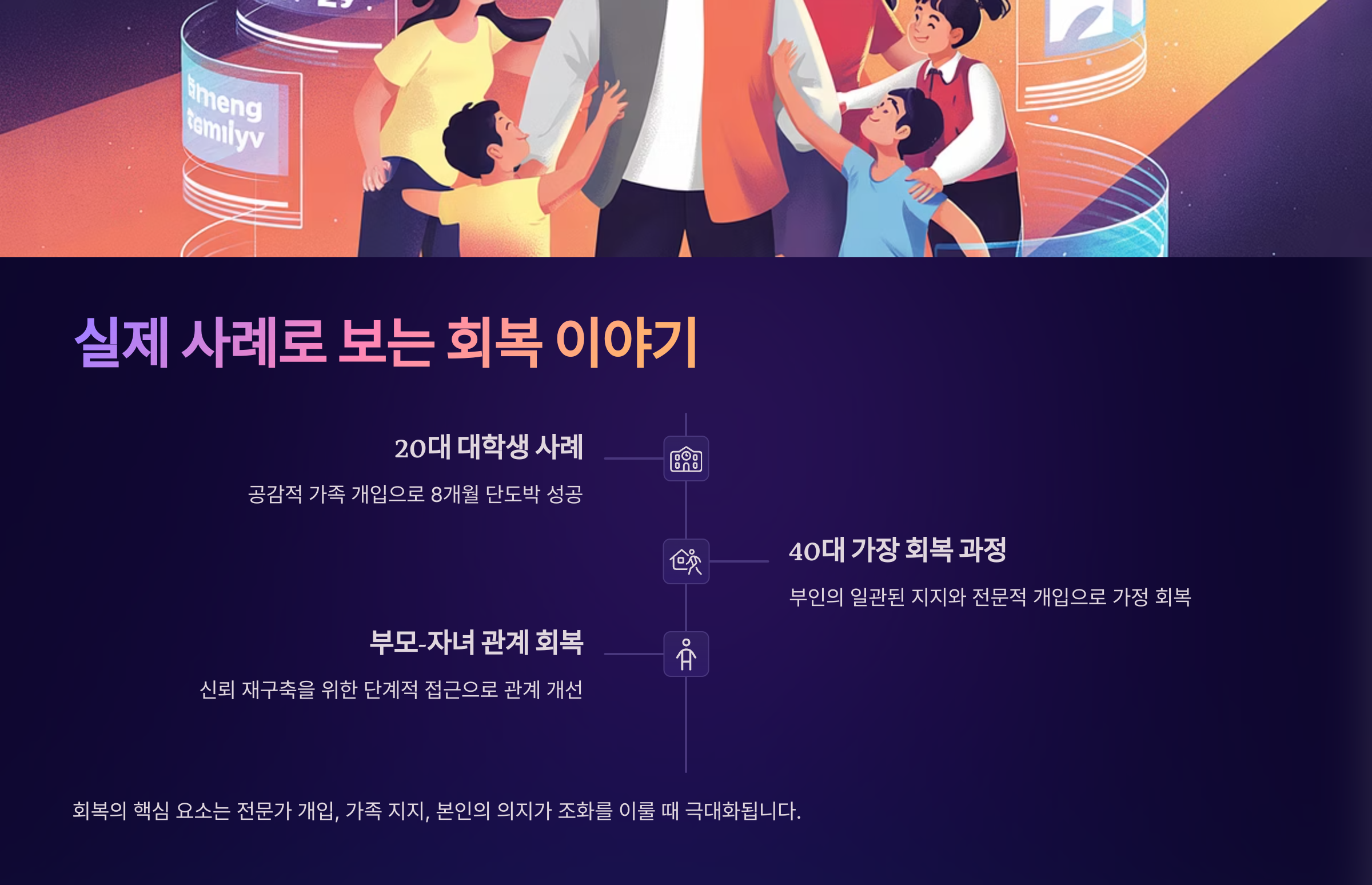 세 번째는 고등학생 C군 이야기예요. 모바일 게임 속 도박 요소에 빠져 용돈을 탕진했지만, 부모님이 일방적인 꾸짖음 대신 '왜 그렇게 했는지'를 들어주며 문제의 뿌리를 함께 찾았어요. C군은 이후 자존감을 회복하며 학업에도 집중할 수 있게 되었어요.