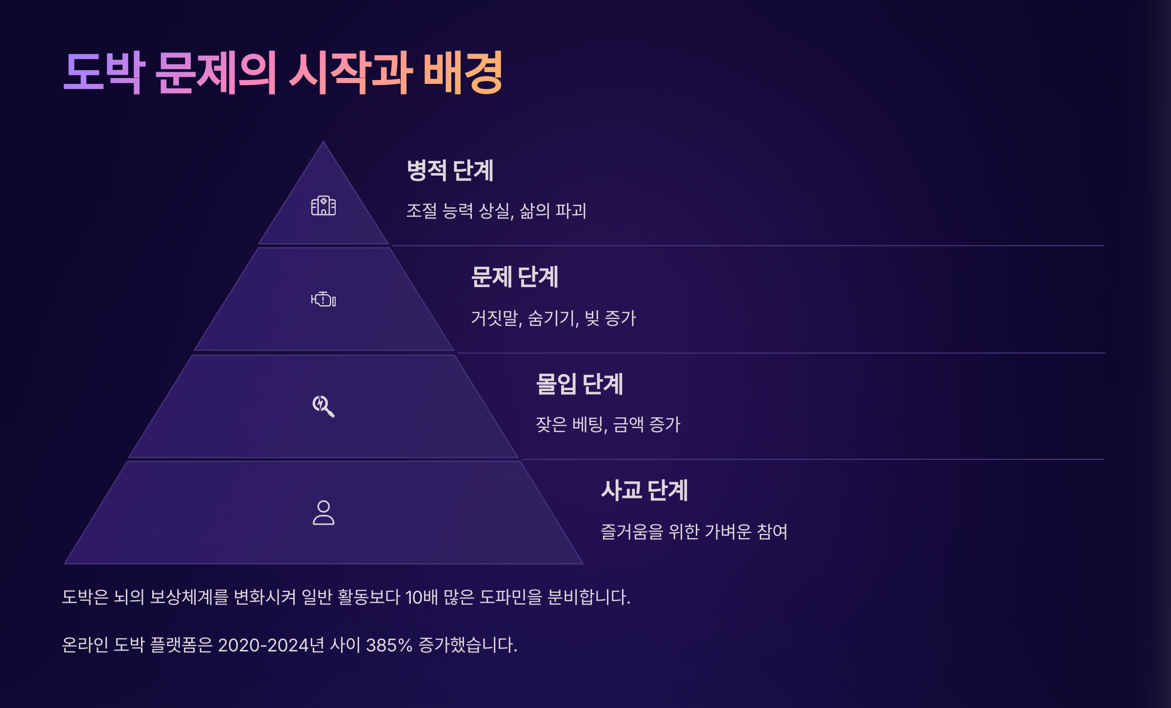 도박에 빠지는 이유는 단순히 재미 때문만은 아니에요. 스트레스 해소, 외로움, 성취감 부족 등이 복합적으로 작용할 때 도박은 일시적인 탈출구가 되어버리기도 해요. 특히 청소년기나 청년기에는 감정 조절 능력이 아직 완성되지 않아 위험에 더 쉽게 노출될 수 있어요.