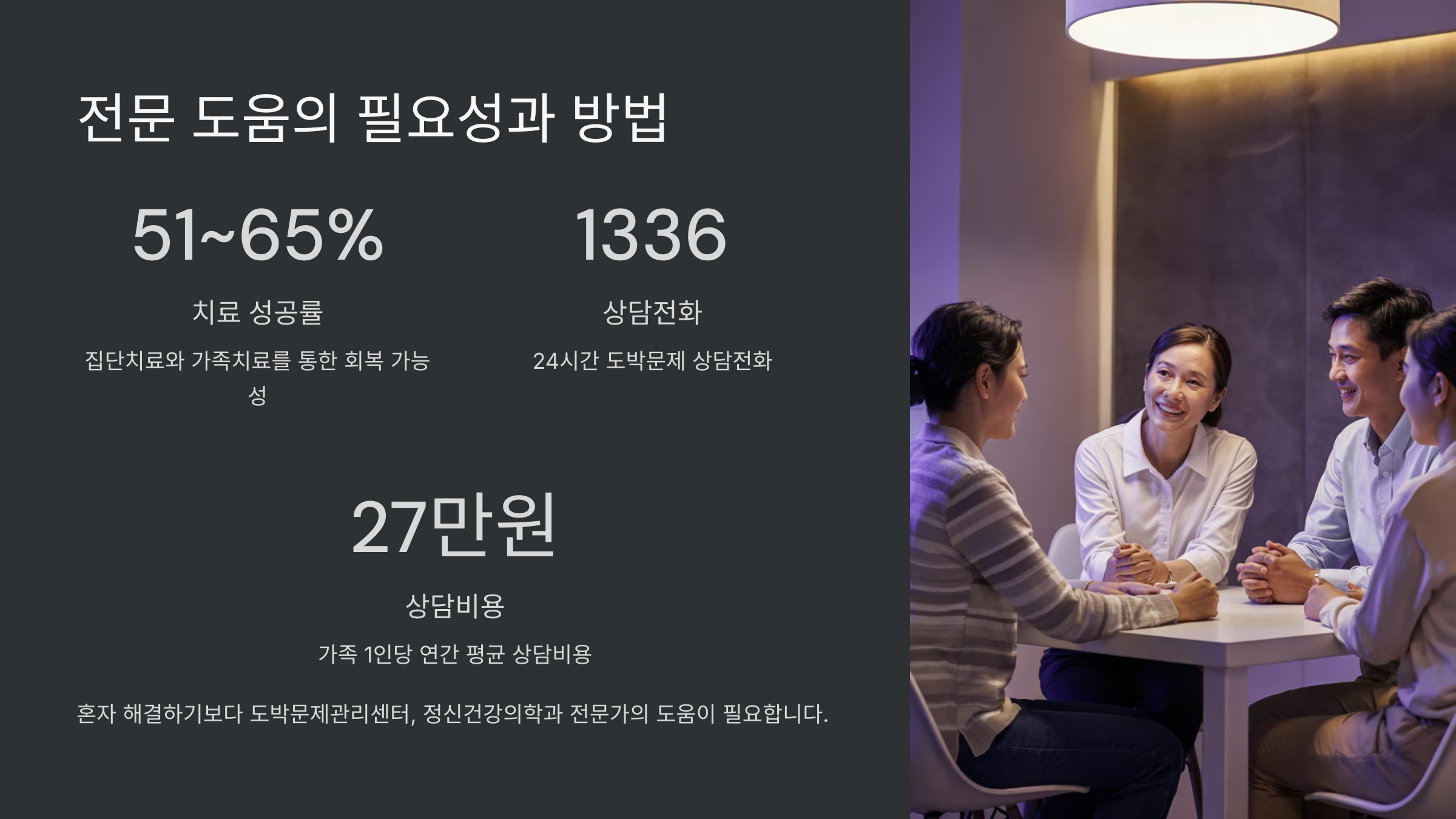 도박 중독은 단순한 습관이 아니라 뇌의 보상 시스템이 왜곡된 상태예요. 그래서 의지만으로 벗어나기 어려운 거예요. 이럴 때 전문가는 인지행동치료, 동기강화치료 같은 과학적인 방법으로 자녀의 사고방식과 행동 패턴을 교정할 수 있도록 도와줘요.