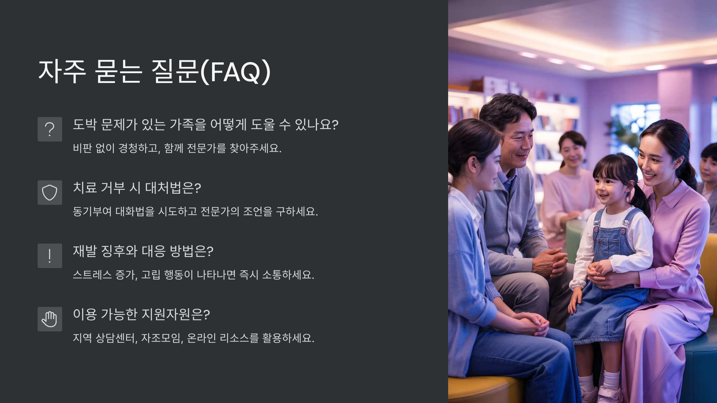 초기 거부 도움 거부, 부인 비난 대신 인내 자각 시점 자책, 불안감 증가 공감, 위로 제공 변화 노력 재발 우려 존재 일관된 지지 가족의 역할은 '믿어주는 것'부터 시작돼요. 그 믿음은 자녀가 다시 자신을 믿게 만드는 가장 큰 이유가 될 수 있어요. 도박은 단절을 만든다면, 가족은 다시 이어주는 끈이 되어야 해요. 그 끈이 튼튼할수록 자녀는 다시 살아갈 힘을 얻을 수 있어요.
