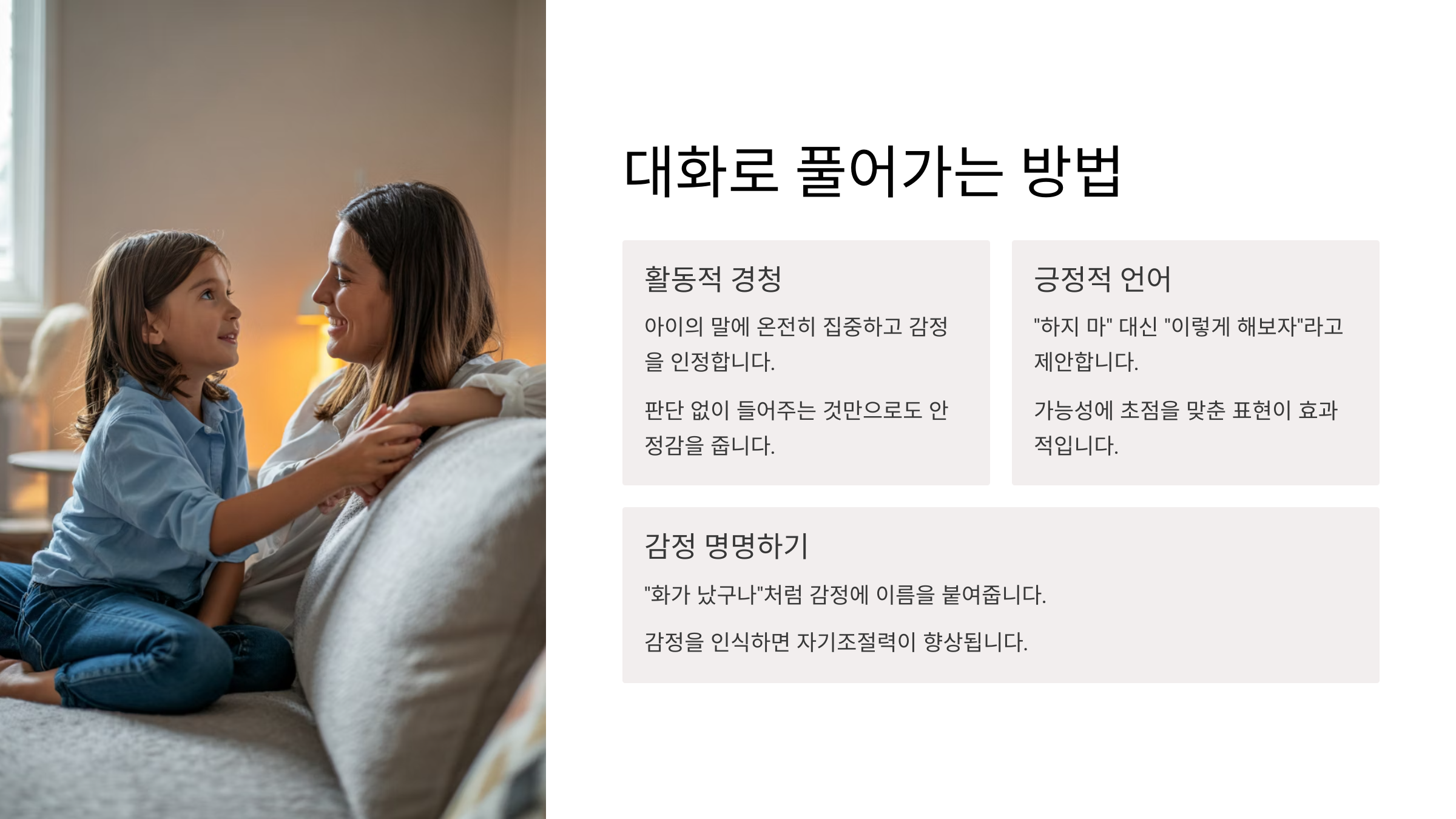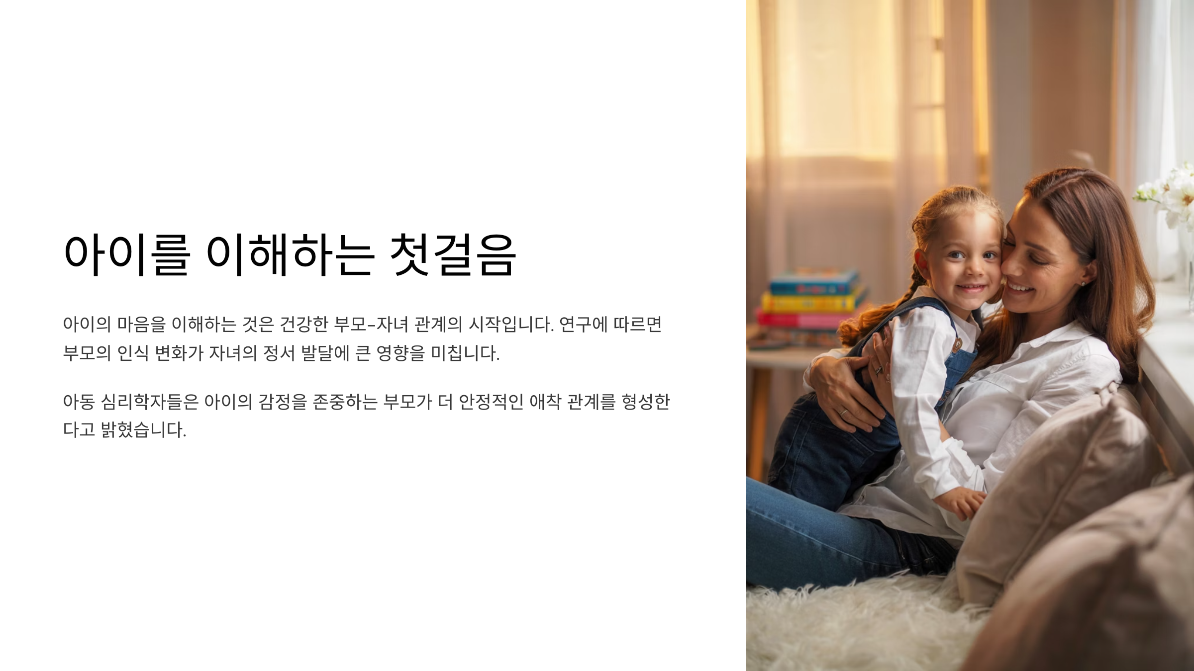 내가 생각했을 때, 어릴 때 부모님이 제 감정을 먼저 이해해주려고 했을 때 마음이 훨씬 편안하고 안정됐던 기억이 있어요. 아이에게도 그런 따뜻한 경험을 선물해주고 싶지 않나요? 😊