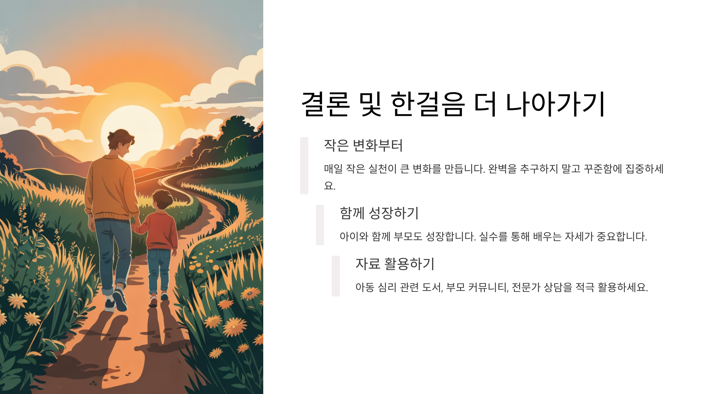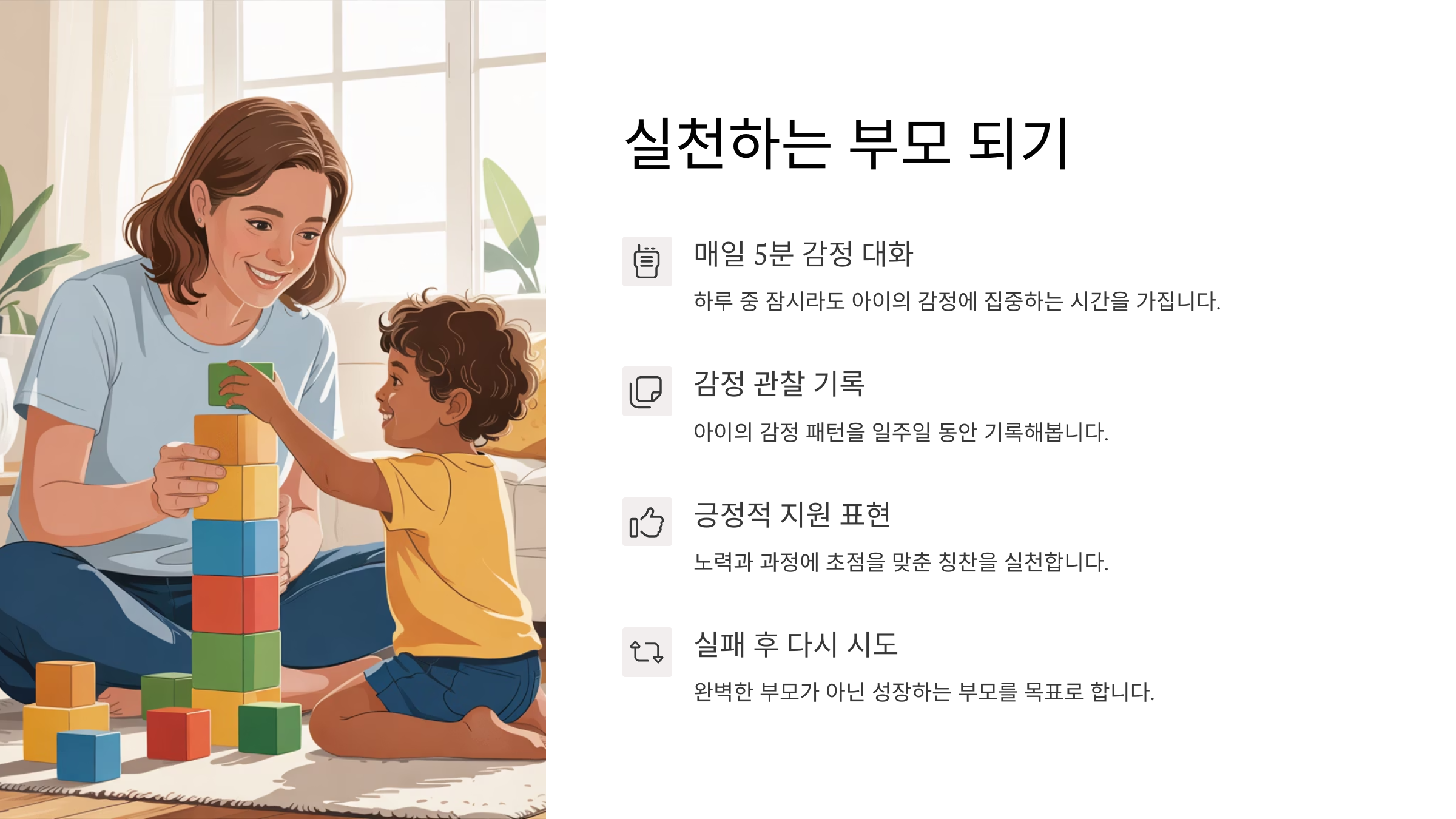 이제까지 많은 이론을 알아봤지만, 결국 중요한 건 "실천"이에요. 알고만 있는 것과 실제로 행동하는 것 사이에는 큰 차이가 있어요. 부모의 작은 실천 하나가 아이에게는 세상을 바라보는 창이 되어준답니다 🌟.