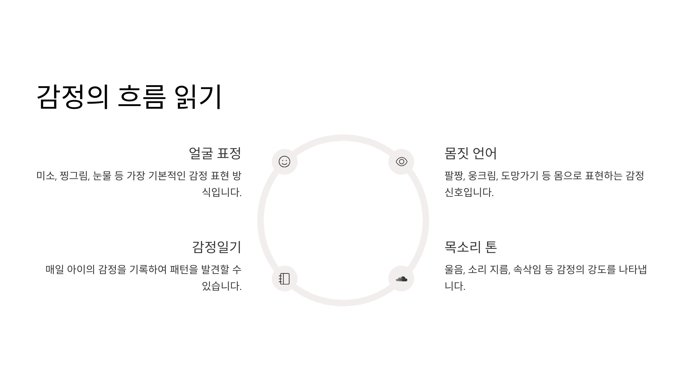또한, 감정을 읽는 과정에서는 언어보다 표정, 몸짓, 행동을 유심히 관찰하는 게 중요해요. 아이들은 아직 감정을 명확히 말로 표현하는 데 서툴기 때문에, 말보다 행동으로 감정이 드러나는 경우가 많거든요.