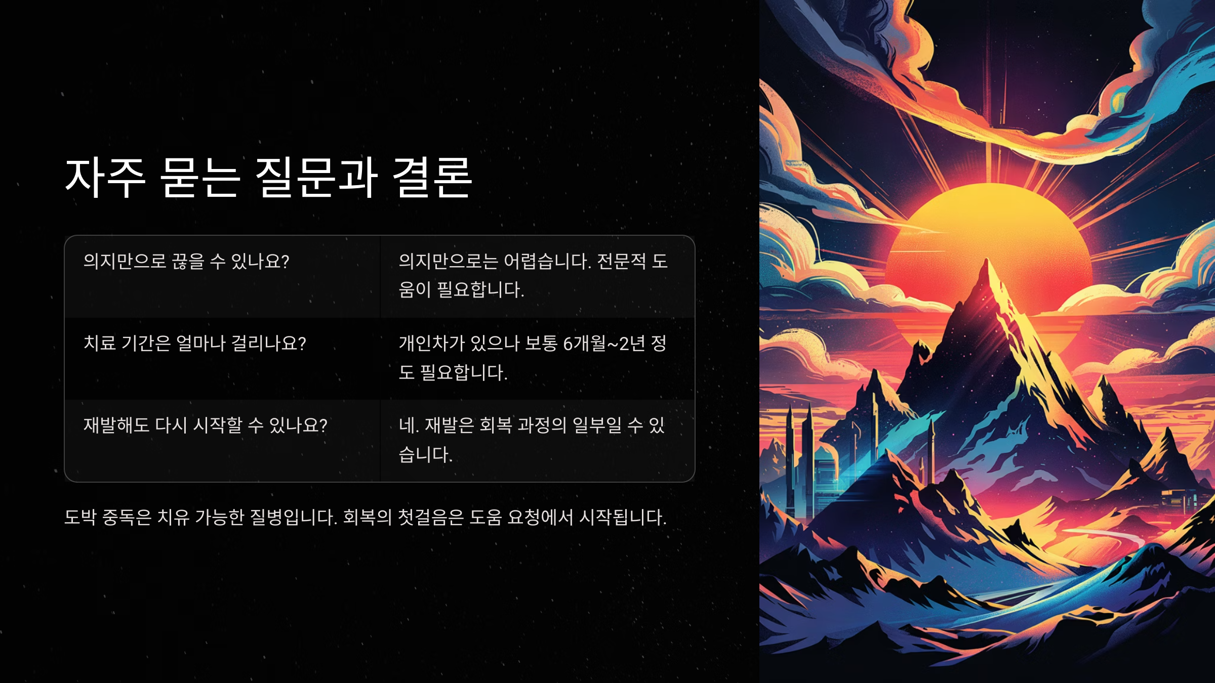 Q1. 도박 끊으려면 무조건 병원에 가야 하나요?A1. 꼭 병원만이 답은 아니에요. 자조 모임이나 전문 상담센터 이용도 큰 도움이 돼요.