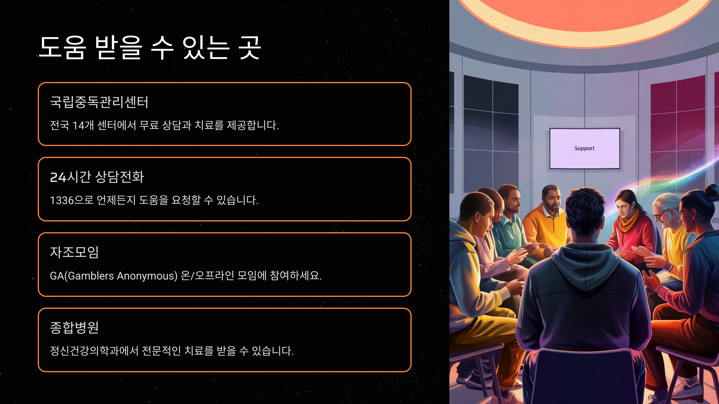 또한 '도박중독자 모임(GA)' 같은 자조모임에 참여하는 것도 좋아요. 같은 문제를 겪고 있는 사람들과 함께 경험을 나누다 보면 혼자가 아니라는 걸 느끼게 되거든요. 진짜 큰 힘이 돼요.